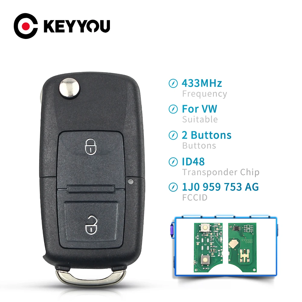 Автомобильный пульт дистанционного управления KEYYOU, 434 МГц, 433 МГц, чип ID48 для Volkswagen, VW, Beetle, Bora, Golf, Passat транспортер поло, T5, 1J0959753AG