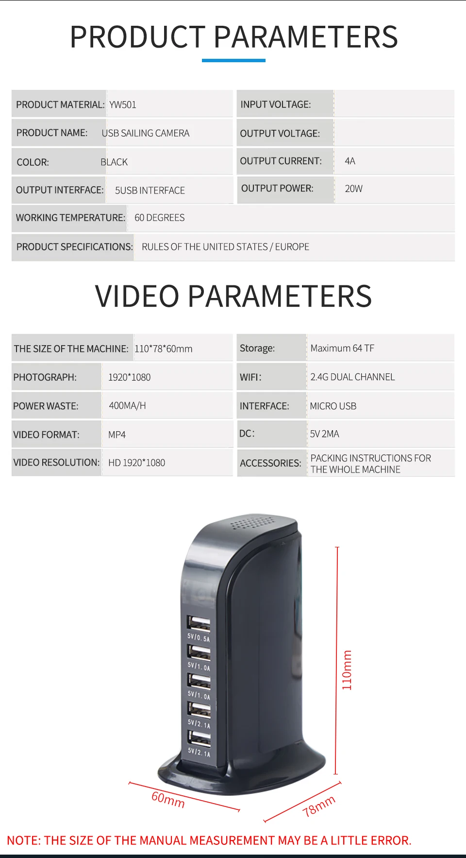 Особенности:1. Ультра HD объектив камеры, более четкий.2. Сжатые файлы, больше места для хранения.3. Запись видео в формате Full HD 1080P.4. Высокая емкость хранения данных, максимальная поддержка 128 ГБ (класс 10).5. Есть видео, запись, обнаружение движения, ночное видение и т. д. Функции.6. Обнаружение движения, не пропустите замечательный момент.Описание:Этот продукт представляет собой зарядное устройство высокой четкости 1080P @ 25 frame WIFI с внешней SD/TF картой памяти. Как Многофункциональная камера, Она интегрирует камеру с видеозаписью, обнаружением движения, хранением и 5 разъемами USB, они питаются от AC100-240V.Характеристики:Модель: P12Разрешение: 1080PФормат видео: AVIНомер оправы: 25Расстояние обнаружения движения камеры: 6 метров прямойМинимальное освещение: 1 люксСжатый Формат: H.264Диапазон записи: 5м ²Мощность Потребляемая мощность: 240MA/3,7 VТемпература хранения: -20-80 градусов ЦельсияРабочая температура: -10-60 градусов ЦельсияРабочая влажность: 15-85% относительной влажностиТип карты памяти: tf-карта (не входит в комплект)Мобильная операционная система: Android/iOSКомплект камеры включает в себя:1 мини-камера1 х USB кабель1 х РуководствоПримечание: Эта камера не имеет встроенной памяти, хотя камера может управляться удаленно. Если вы хотите лучше сохранить содержимое камеры или записать информацию. Используйте оригинальную карту памяти 8G-128G. Чтобы обеспечить нормальное использование мини-камеры, пожалуйста, не используйте поддельные карты, рекомендуется покупать с нашей картой памяти, спасибо за сотрудничество!Примечание:1. Из-за разницы между различными мониторами изображение может не отражать фактический цвет изделия. Мы гарантируем, что модель реального изделия не отличается от представленной на фото.2. Возможны незначительные отклонения в размерах из-за различных измерений вручную.