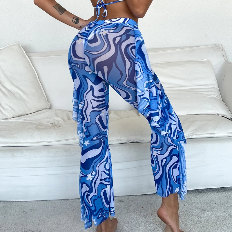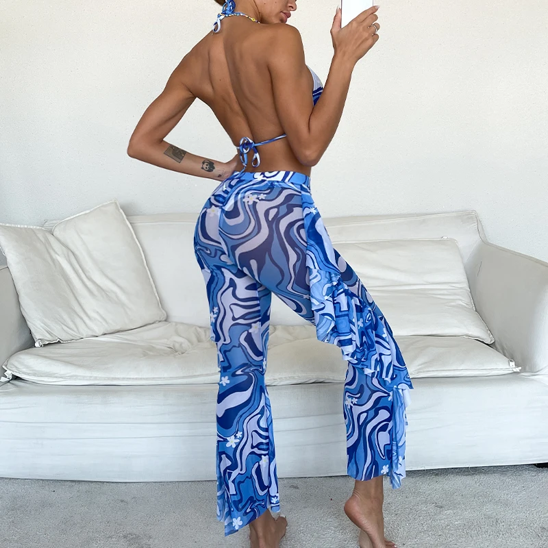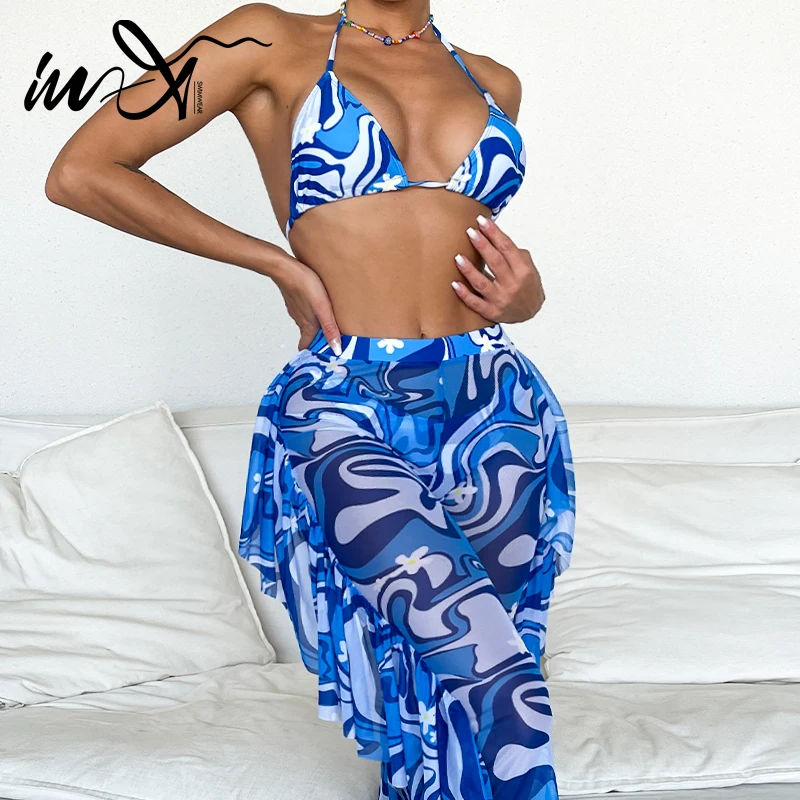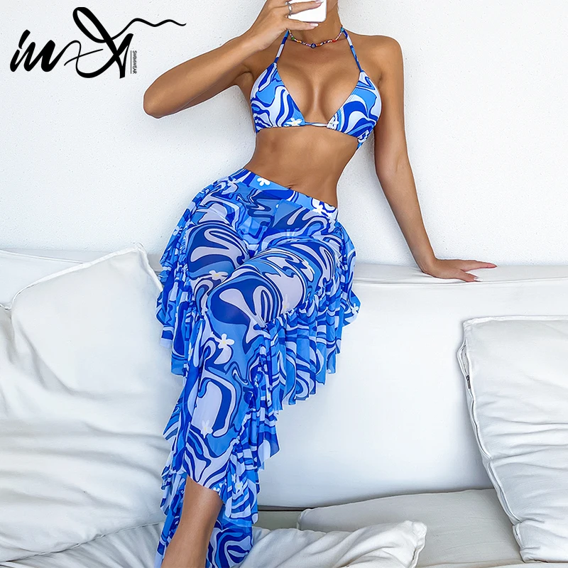 Комплект бикини с высокой талией In-X, купальник с принтом, женский купальник с лямкой на шее, женский купальный костюм с оборками, длинный комплект из 3 предметов, сексуальный купальный костюм