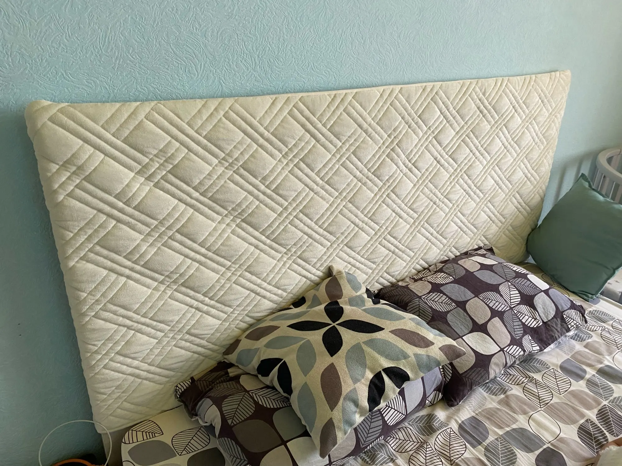 Спасибо ОГРОМНОЕ продавцу! Покупала родителям на спинку кровати,так как у них из эко кожи все изголовье кровати потрескалось! Лицевая сторона покрыта стёганной тканью,сверху ткань похожа на велюр и очень мягкая.С нижней стороны ткань тянется по всей ширине кровати. И эта ткань ооочень мягкая,единственное что не понятно мне для чего с задней стороны сделаны отверстия под кармашки?Заказывала цвет молочный,такой и пришёл. Швы все аккуратные.