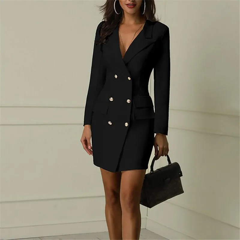 Женский облегающий блейзер с лацканами и длинным рукавом, двубортные короткие платья, офисные женские элегантные однотонные праздничные платья