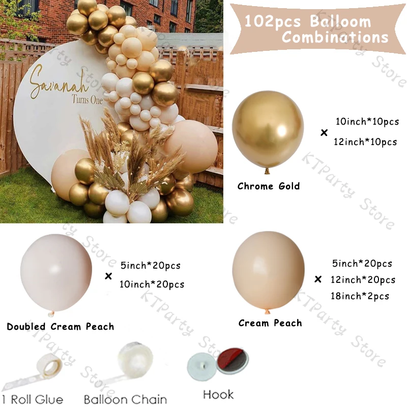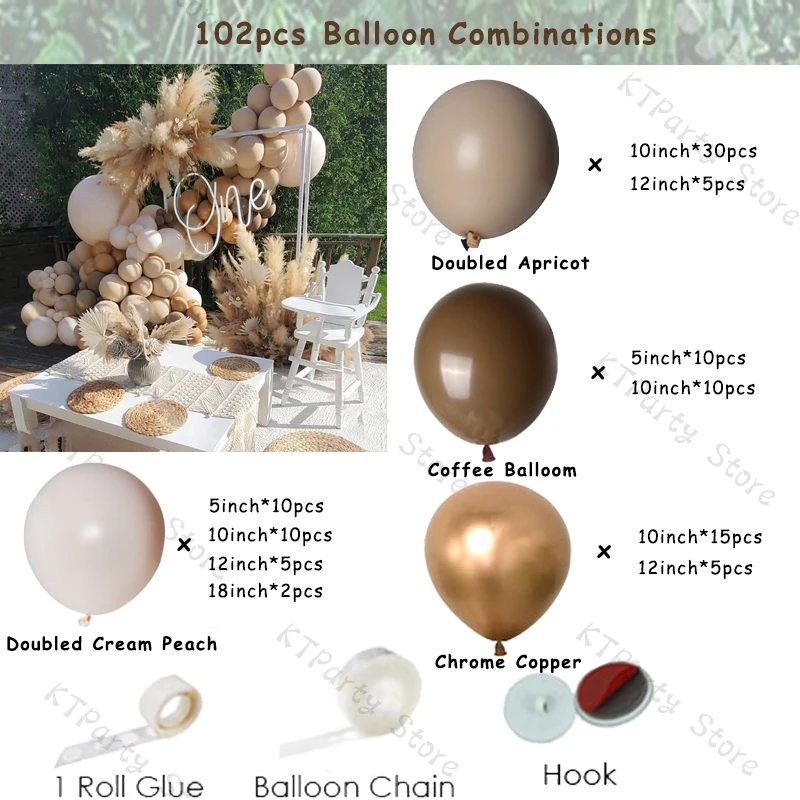 102 воздушный шар Упаковочный лист:Абрикосовый (10 дюймов * 30 шт., 12 дюймов * 5 шт.)Крем персиковый (5 дюймов * 10 шт., 10 дюймов * 10 шт., 12 дюймов * 5 шт., 18 дюймов * 2 шт.)Кофейный шар (5 дюймов * 10 шт., 10 дюймов * 10 шт.)Хромированная медь (10 дюймов * 15 шт., 12 дюймов * 5 шт.)Бесплатно: рулонный клей * 1(100 шт)Воздушная цепь * 1(5 м)Крючок * 3