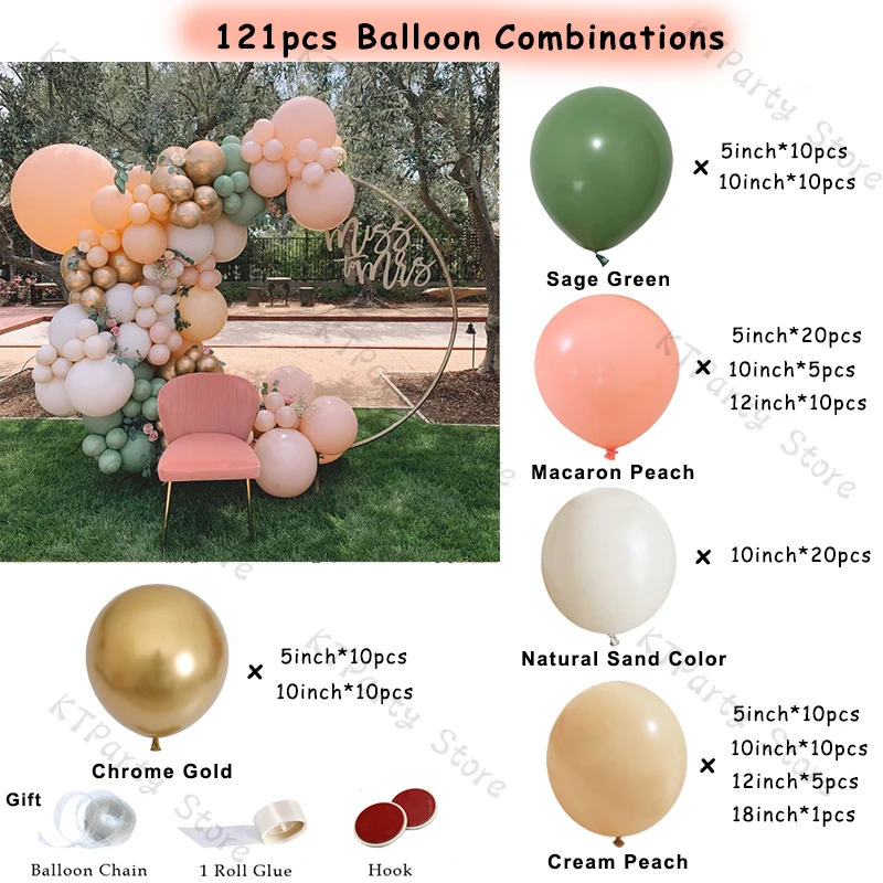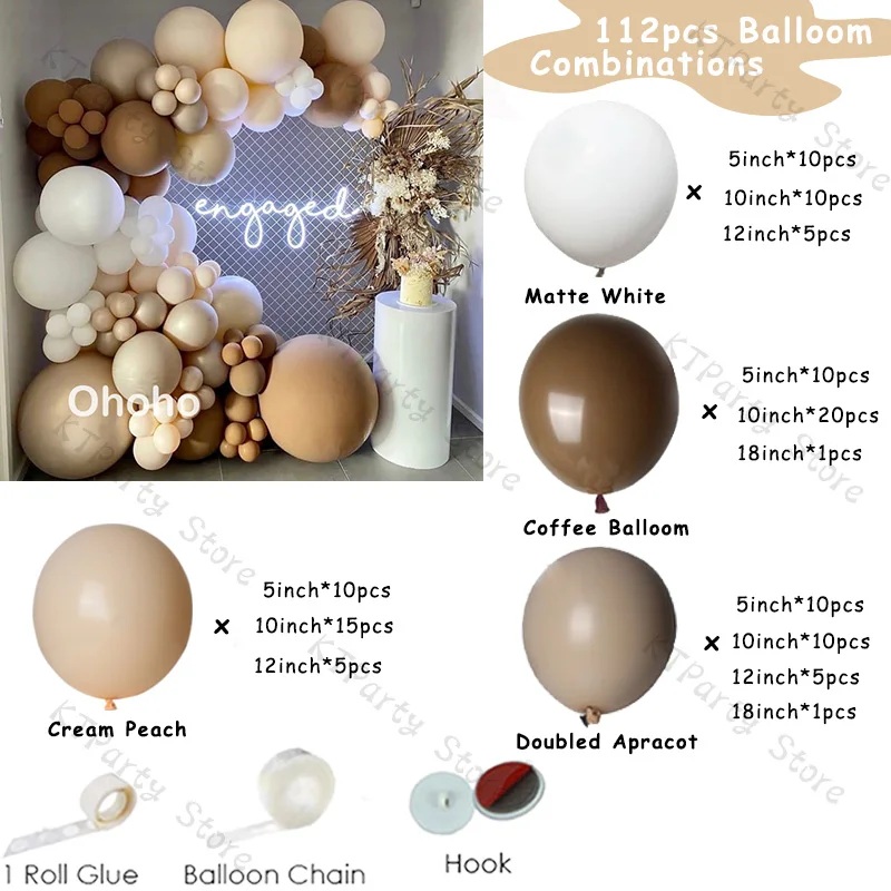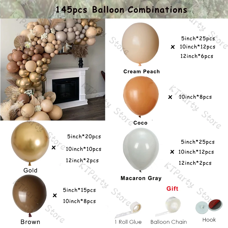 115 шт (11 футов) воздушный шар Упаковочный лист:Кофе (5 дюймов * 10 шт., 10 дюймов * 30 шт.)Кремовый персик (5 дюймов * 10 шт., 10 дюймов * 30 шт.)Крем-персик в два раза (5 дюймов * 5 шт., 10 дюймов * 30 шт.)Бесплатно: рулонный клей * 1(100 шт)Воздушная цепь * 1(5 м)Крючок * 3