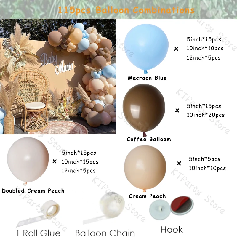 115 упаковочный лист воздушных шаров:Синий Макарон (5 дюймов * 10 шт., 10 дюймов * 10 шт., 12 дюймов * 5 шт.)Кофе (5 дюймов * 15 шт., 10 дюймов * 20 шт.)Кремовый персик (5 дюймов * 5 шт., 10 дюймов * 10 шт.)Крем-персик в два раза (5 дюймов * 15 шт., 10 дюймов * 15 шт., 12 дюймов * 5 шт.)Бесплатно: рулонный клей * 1(100 шт)Воздушная цепь * 1(5 м)Крючок * 3