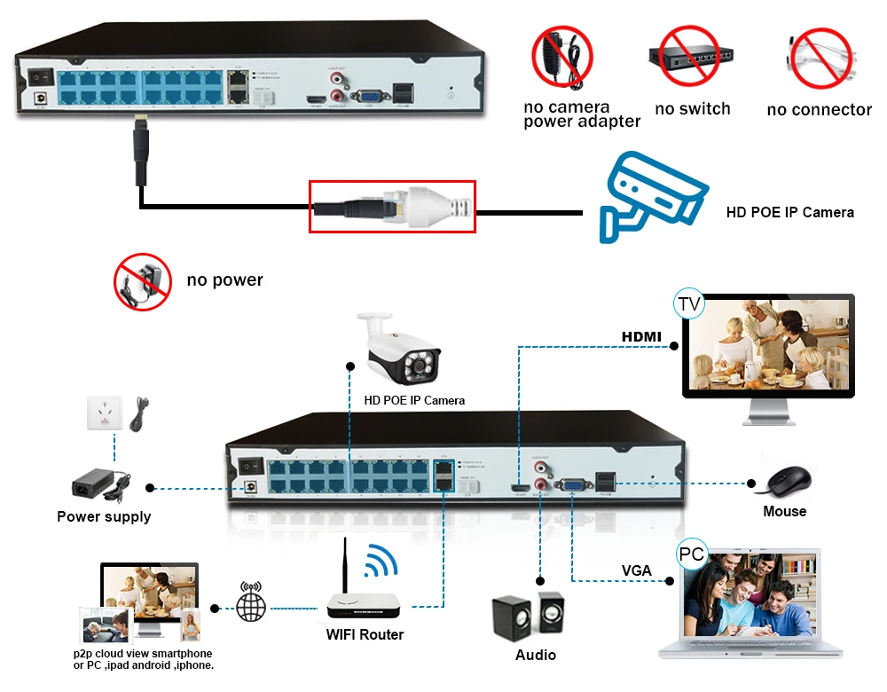 Не нужны дополнительные кабели питания или адаптеры или переключатели. Подключи и работай и простая настройка.Экономьте деньги и удобно, POE NVR = NVR + POE коммутатор