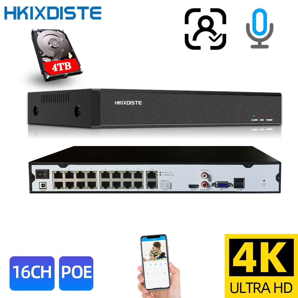 Сетевой видеорегистратор HKIXDISTE, 16 каналов, 4K, POE, для систем видеонаблюдения, сетевой видеорегистратор для 1080P3MP5MP8MP4K POE IP-камеры, сетевой видеорегистратор H.265 +