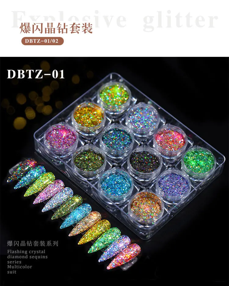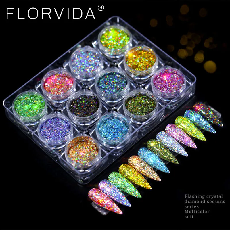 FlorVida 12 шт. набор для дизайна ногтей Блестящий со стразами и пайетками голографическая пудра смешанный для дизайна ногтей маникюрный набор украшений дюжина