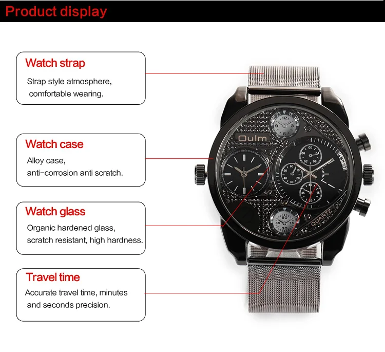 Спецификация (приблизительно):Диаметр: 5 смДлина ремешка часов: 23 смШирина ремешка: 2,2 смМеханизм: кварцевыйПосылка входит:1 x часы большого размера Oulm