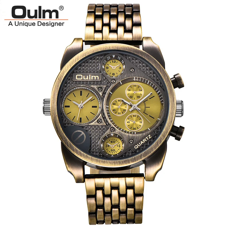 Мужские кварцевые часы Oulm, бронзовые ретро часы с большим цифербл...