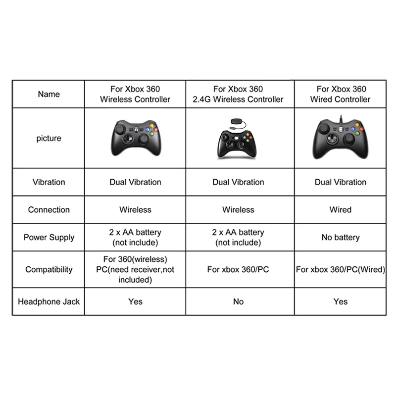 Для беспроводного контроллера xbox 360 2,4G, он cames с приемником 2,4G, так что вы можете подключить для xbox 360/PC по беспроводной сети. Он также встроен в двойную вибрацию, ему нужны 2 батарейки AA (не входят в комплект), и без разъема для наушников. Приемник контроллера 2.4g может использоваться только для контроллера 2,4G!