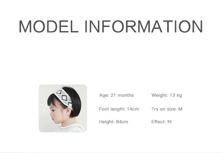 Информация о модели: 2 года; Примерьте Размер M; Рост 108 см; Вес 11 кг; Длина стопы 14 см; Эффект: подходит (для справки)