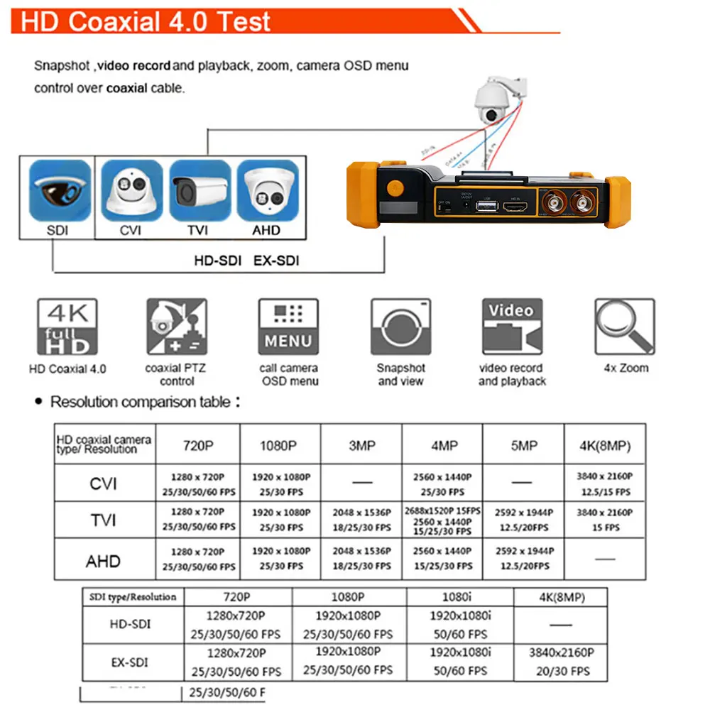 ● 5 дюймов TFT-LCD экран, 800*480 разрешение● 8MP TVI тест, 3840x2160P 12,5/15 кадров в секунду, коаксиальный контроль поворотной камеры с увеличительным объективом и вызова OSD меню● 8MP AHD тест, 3840x2160P 15 FPS, коаксиальный PTZ и вызов OSD меню● 8MP CVI тест, 3840x2160P 12,5/15FPS, коаксиальный кабель PTZ и вызова OSD меню● Тест на EX-SDI 8 Мп, 3840x2160P 25/30 кадров в секунду, коаксиальный PTZ и меню вызова OSD *