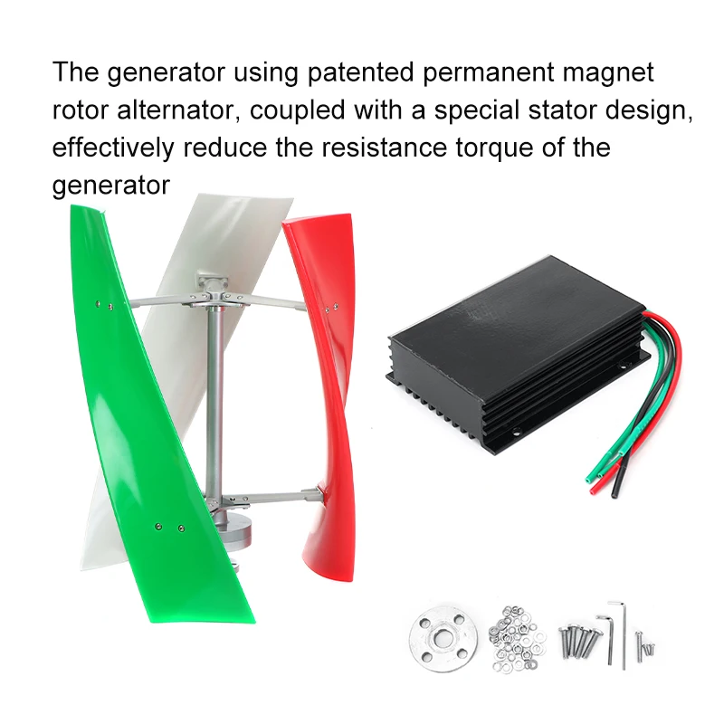 Посылка включает в себя:1 х ветряная турбина1 x контроллерХарактеристики:-Максимальная мощность: 400 Вт/600 Вт/800 Вт-Цвет: белый, красный, зеленый-Номинальное напряжение: 12 В/24 В/48 в-Количество листьев: 3 шт.-Метод торможения: электромагнитныйОсобенности:-Запуск скорости ветра низкий, высокая энергия ветра; Малый размер, хороший внешний вид, низкая рабочая Вибрация;-Установка удобного дизайна, удобная установка оборудования, техническое обслуживание и ремонт;-Использование высокомощного интеллектуального управления микропроцессором, эффективное регулирование тока и напряжения;-Емкость анти-тайфуна прочна, безопасна и надежна в эксплуатации;-Лезвие ветрового колеса с новой технологией путем прецизионного литья под давлением в сочетании с оптимизацией аэродинамического дизайна формы и конструкционного дизайна, высоким коэффициентом использования энергии ветра, увеличением годового производства электроэнергии;-Генератор с использованием запатентованного постоянного магнита ротора генератора, в сочетании со специальной конструкцией статора, эффективно уменьшает крутящий момент сопротивления генератора, в то время как ветровое колесо и генератор имеют лучшую соответствующую характеристику, надежность работы устройства.Примечание:1. Допускается погрешность в 1-3 см из-за ручного измерения. Перед размещением заказа, пожалуйста, внимательно ознакомитесь со всеми условиями.2. Цвета могут отличаться, так как на дисплее разница, пожалуйста, поймите.