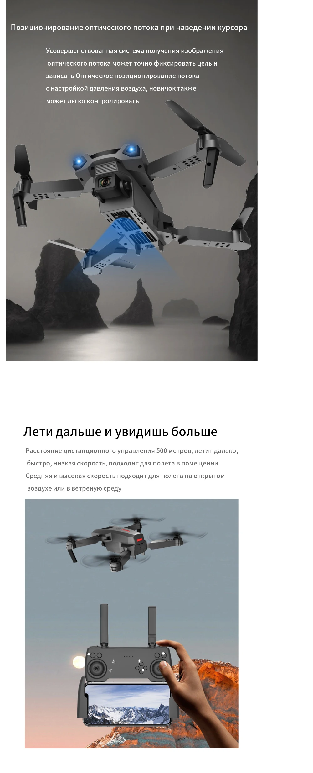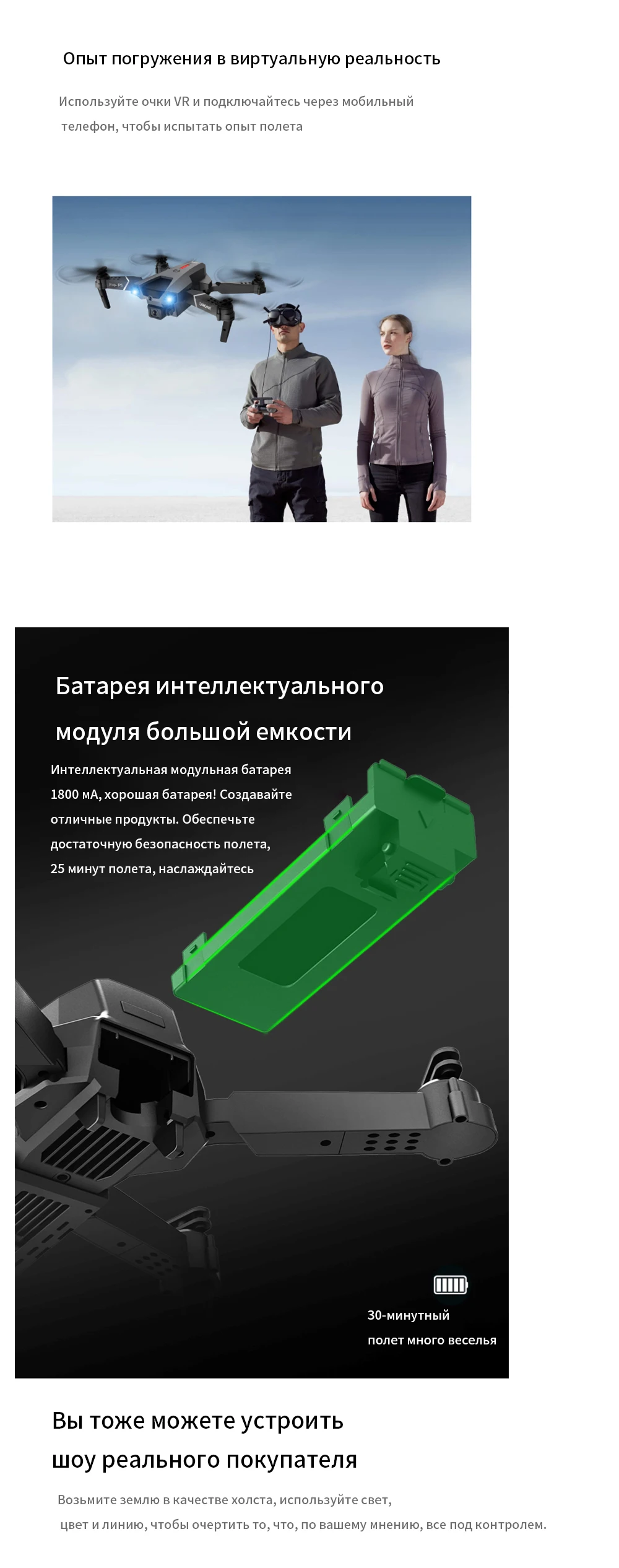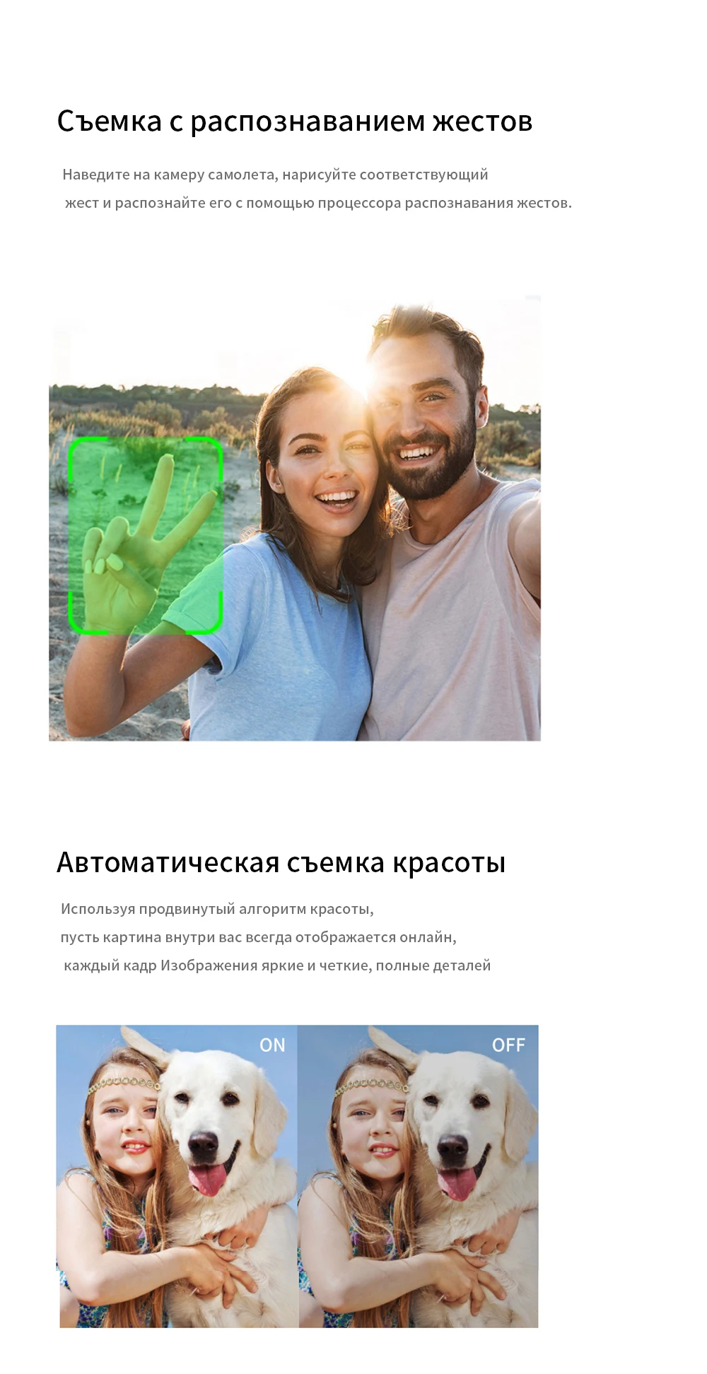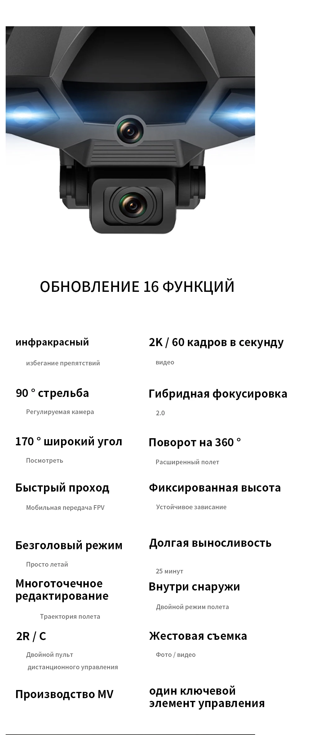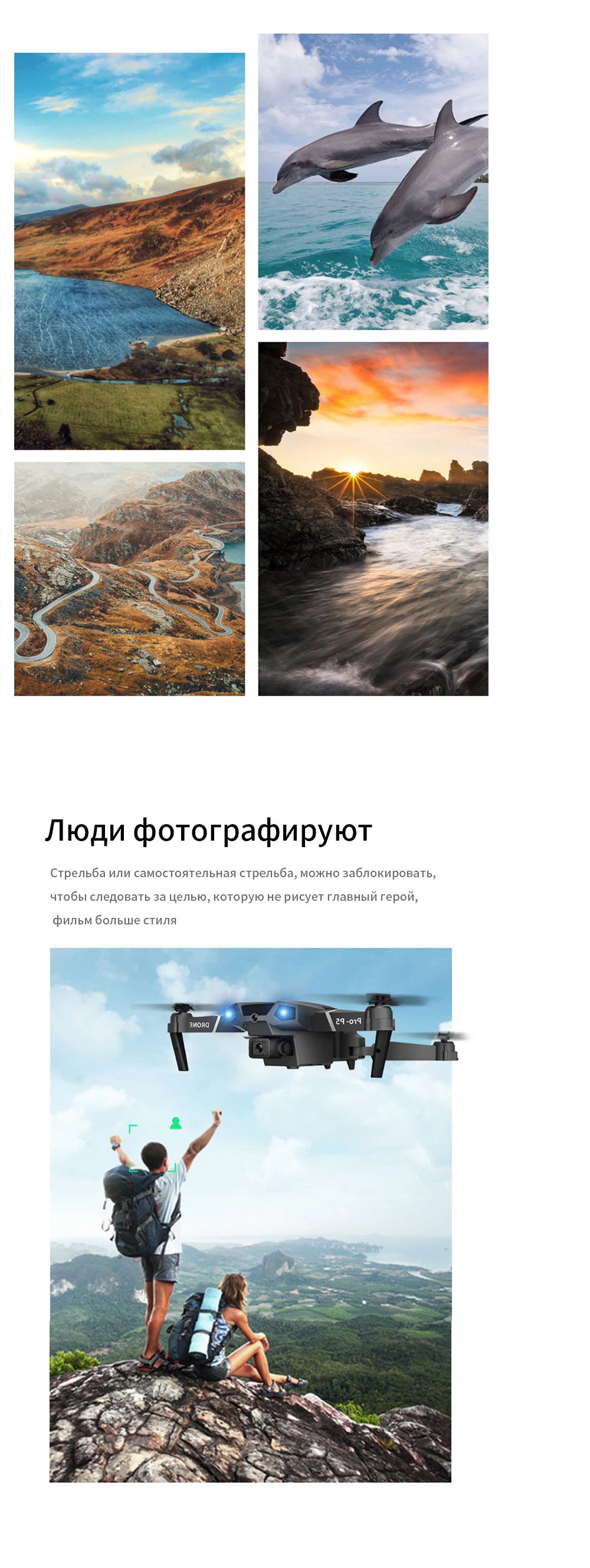 -Подписывайтесь на меня. Куда бы вы ни пошли, дрон автоматически отслеживает и захватывает вас. Делайте снимки в любое время, легко снимайте сложные фотографии и используйте функции полета без помощи рук и функции селфи.