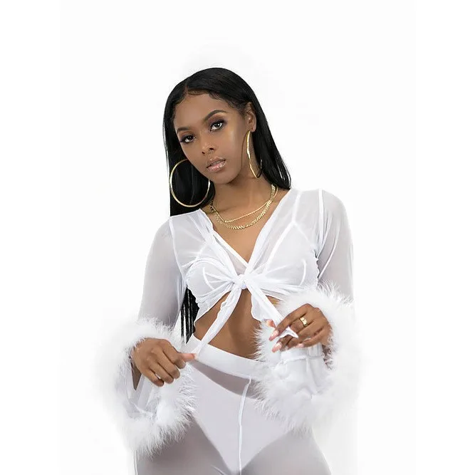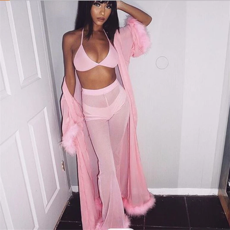 Комплекты женских брюк Dourbesty, расклешенные брюки с длинными рукавами и перьями, прозрачная сетчатая Клубная облегающая одежда