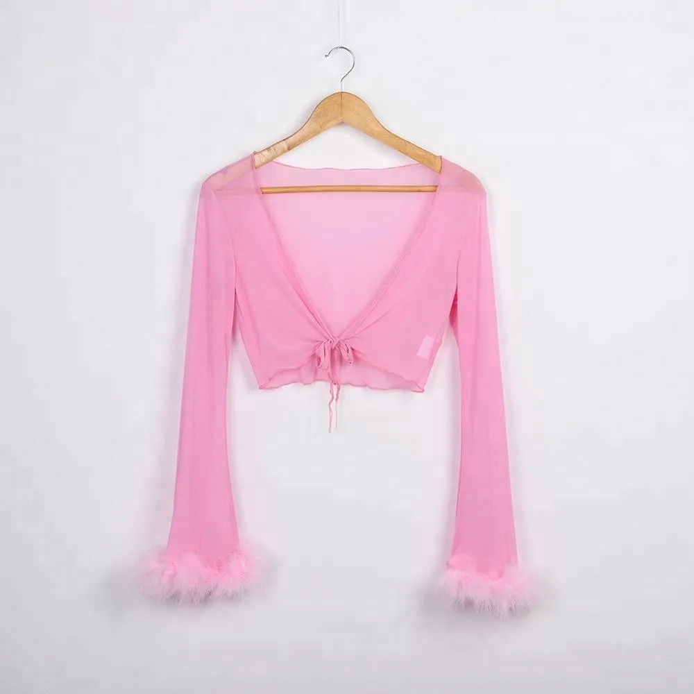Топы с V-образным вырезом и длинными рукавами, прозрачный дизайн, красивый и модный.