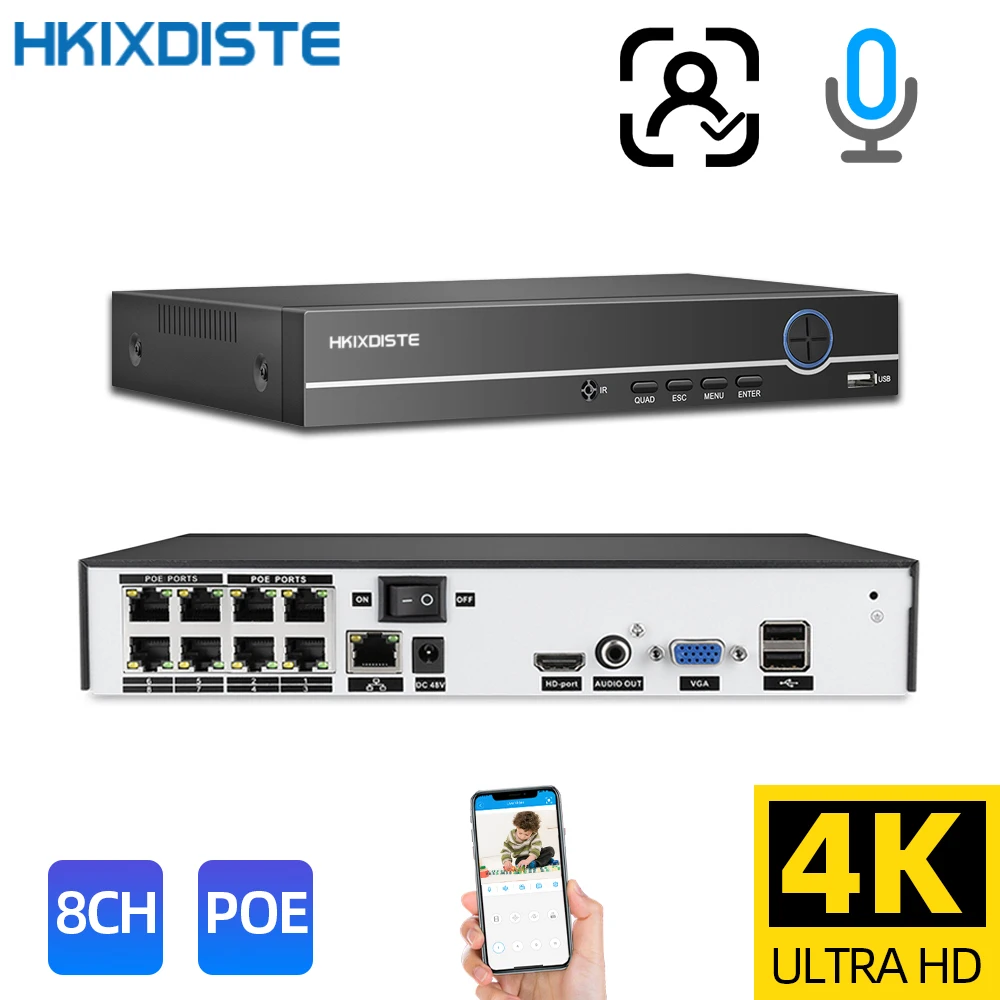 HKIXDISTE Cctv видео наблюдение 8ch 8.0MP H.265 PoE NVR рекордер для HD 1080P 3MP 4MP 5MP 4K POE IP камера PoE NVR 48V