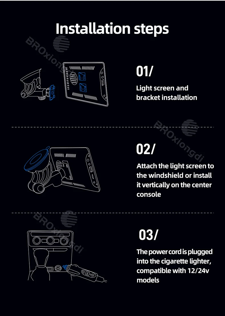 Stop1: светильник для установки экрана и кронштейнаStop2: Прикрепите светильник к ветровому стеклу или установите его вертикально на центральной консолиStop3: шнур питания включен в прикуривателя, Совместимость с 12/24v модели