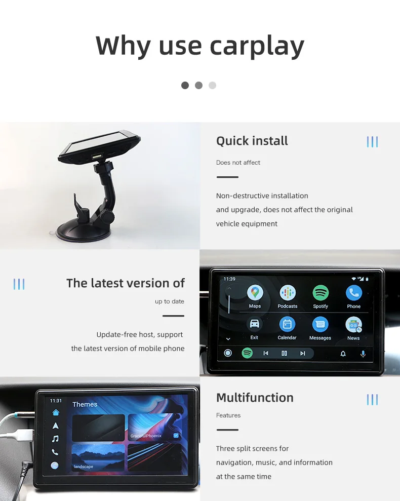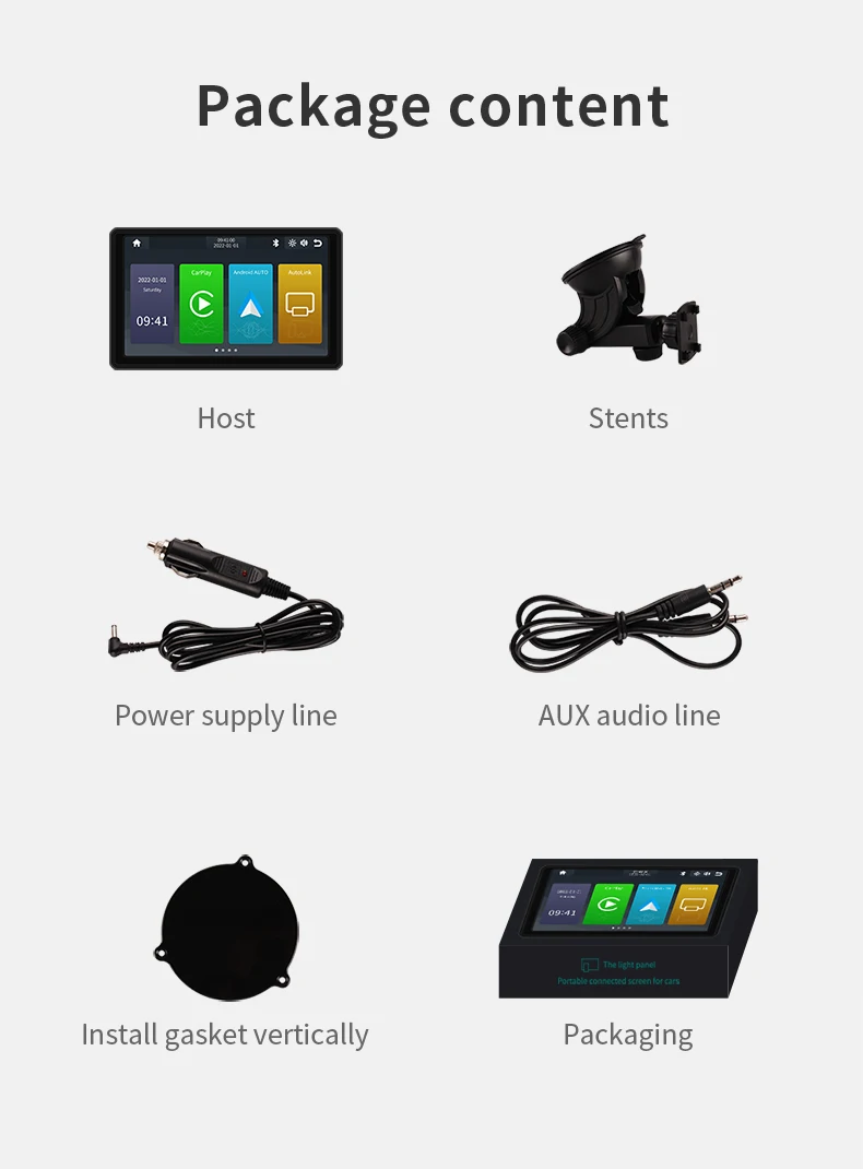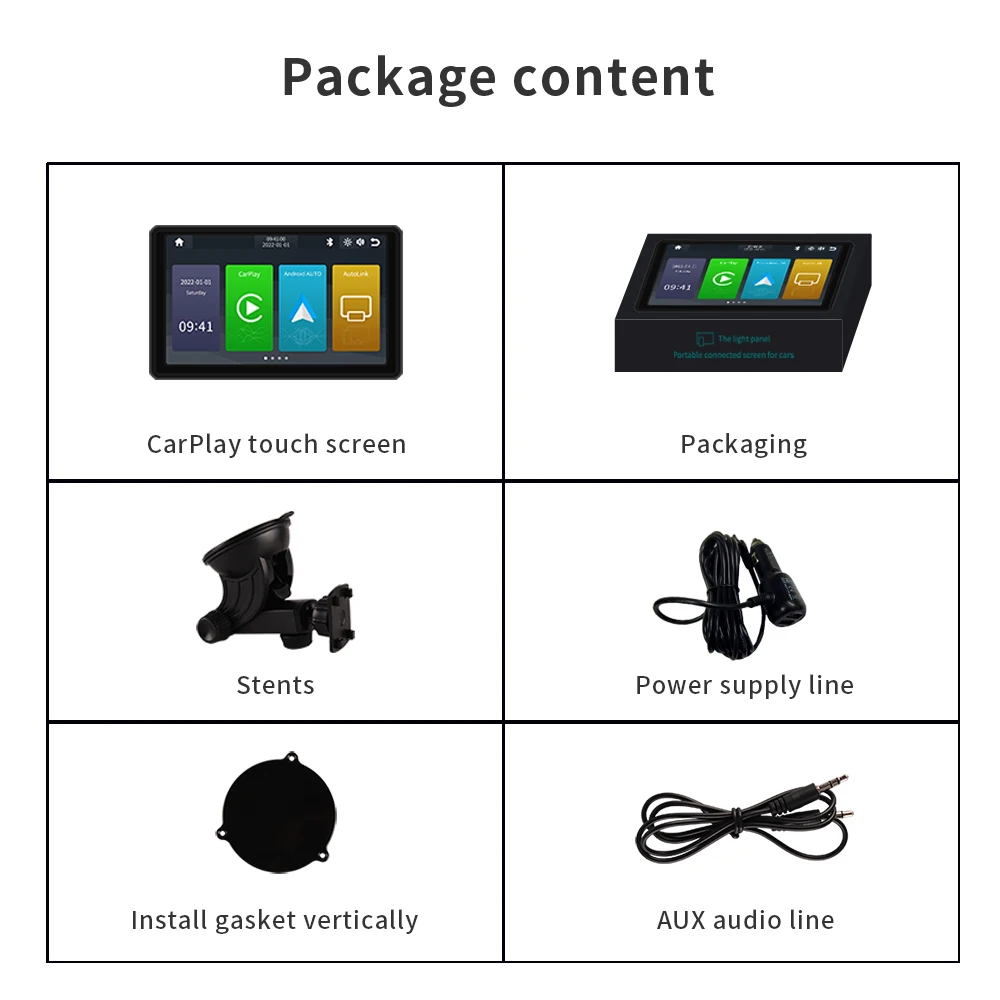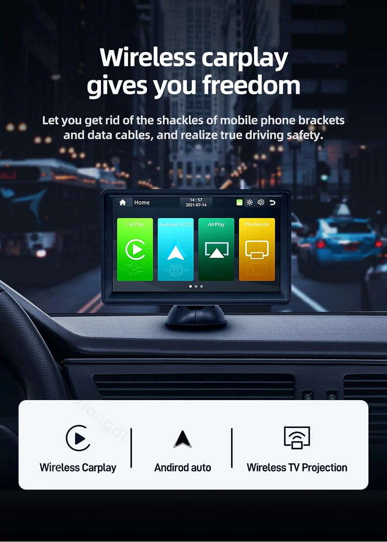 Функции:Беспроводная камера CarPlayПроводной Android авто: Используйте проводное соединение (usb кабель) для входа в автоматическую систему android7 "портативный сенсорный экран, разрешение 1024x600Встроенный Bluetooth-совместимый 4,0Встроенный микрофон для siri функции и Bluetooth-совместимый вызовMicro sd/usb: Поддержка музыки и видеоЗвук работает, синхронизируя тот же fm-радиоканал, что и автомобильный fm-радио или подключая aux кабельПростая установка, подключение и воспроизведение, неразрушающая установка