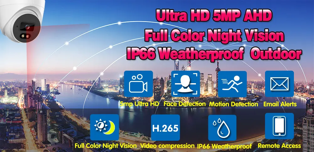 1. Ультра HD 5 Мп дисплей высокой четкости;2. Ультра HD 5MP AHD камера, металлический материал, IP66 водонепроницаемый, подходит для внутреннего и наружного использования; Пылезащитная, надежная Домашняя безопасность;3. Улучшенное H.265 Сжатие видео, подключи и работай, простота установки;4. Поддержка полноцветного дневного ночного видения;5. Поддержка распознавания лица, записи лица, воспроизведения лица, обеспечивает ультра высокое разрешение видео наблюдения, обеспечивая максимальную детализацию и четкость доступны;6. Поддержка ночного видения Ultra HD, расстояние передачи составляет 500 метров;7. Поддержка IR-CUT переключателя двойного фильтра, днем и ночью для достижения мониторинга, цвет не является частичным искажением цвета;8. Поддержка обнаружения движения, оповещения по электронной почте, воспроизведения видео;9. Поддержка Android,Iphone,Ipad, ПК, P2P просмотра;10. Удаленный доступ в любом месте, в любое время;11. Подходит для всех видов мест применения;