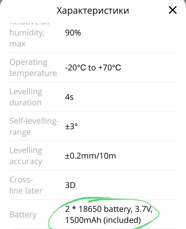 Описание точное, но главное читать правильно, наедалово с 2 х аккумулятор, на самом деле АКБ 1шт, а она состоит из двух элементов 18650. В целом нормальный прибор, регулировка яркости улица/помещение. Качество нивелирования не проверял ещё.