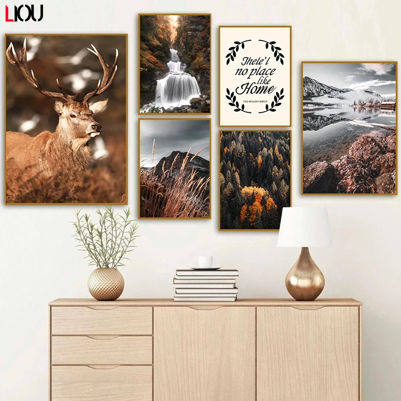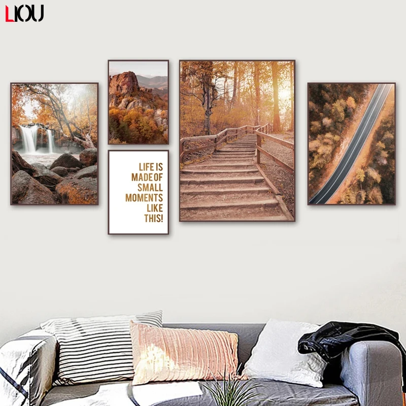 Настенная картина с изображением водопада и осенних листьев, скандинавские настенные плакаты и принты для украшения гостиной