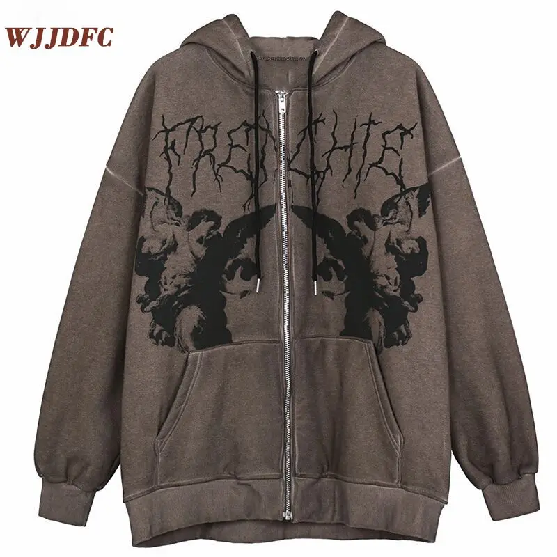 Женские толстовки в стиле Харадзюку, уличная одежда в стиле хип-хоп, куртка большого размера с капюшоном и принтом в виде ангела, пальто в стиле панк, зимние топы на молнии, верхняя одежда