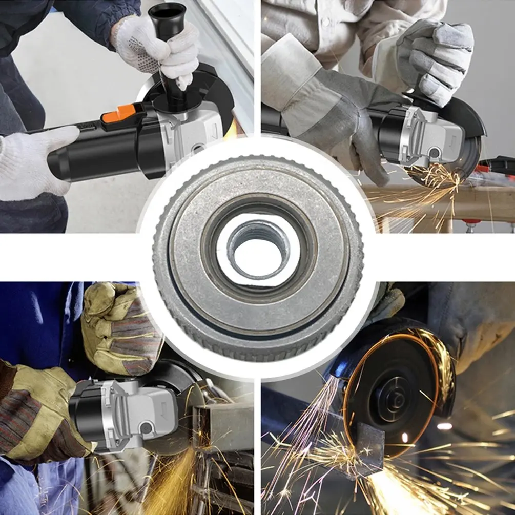 Зажимная гайка подходит для всех угловых шлифовальных машин интерфейса M14 на рынке, она используется для угловых шлифовальных машин и режущих машин с скоростью 1200 Вт 11000r/мин и диаметром шлифовального диска 125. Например, алмазные режущие диски, шлифовальные диски, шлифовальные диски в форме чашки, алмазные пластины и другие типы шлифовальных кругов.
