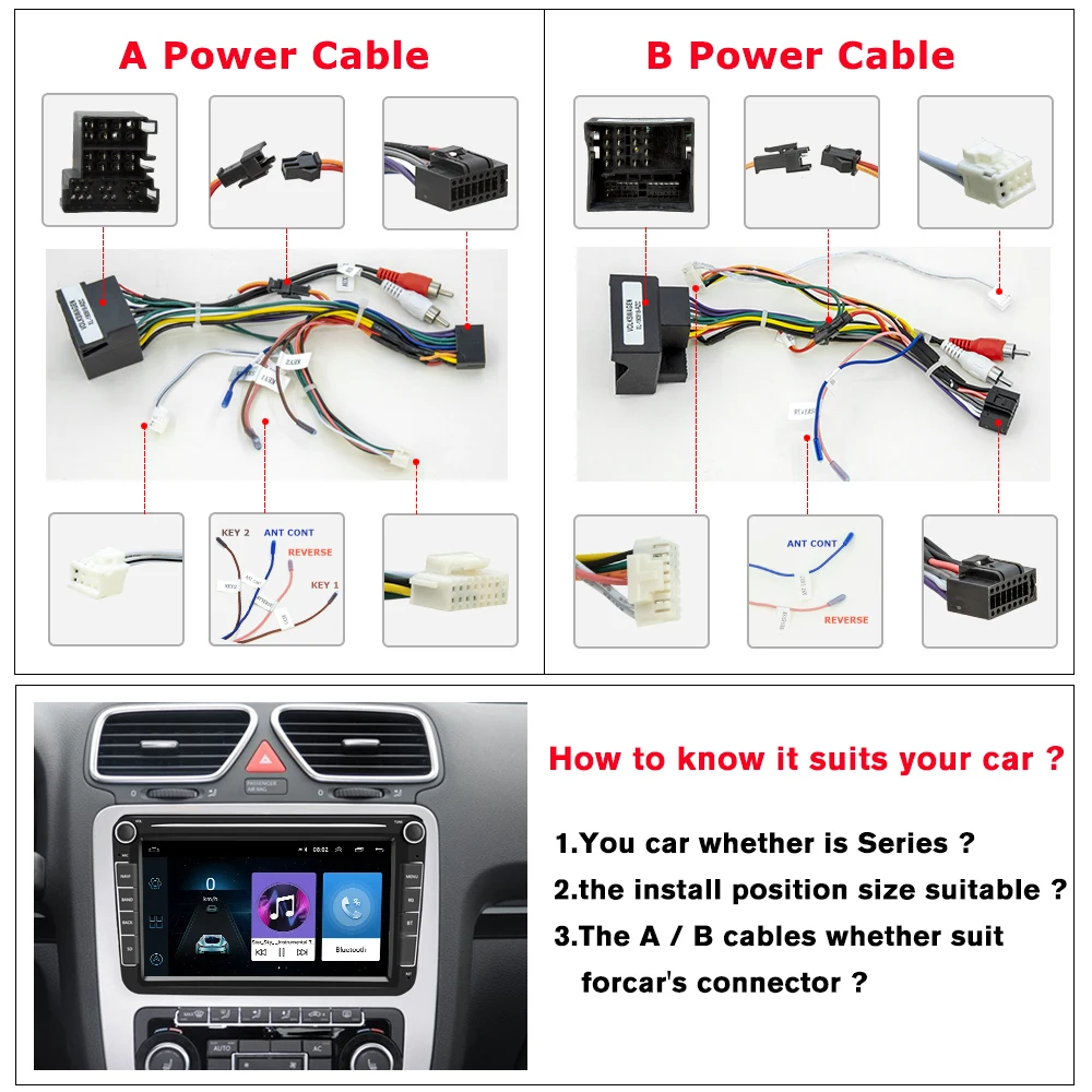 Примечание: Пожалуйста, используйте наши кабели питания для подключения нашего автомобильного радио, невозможно вставить оригинальную автомобильную вилку непосредственно в нашу машину.
