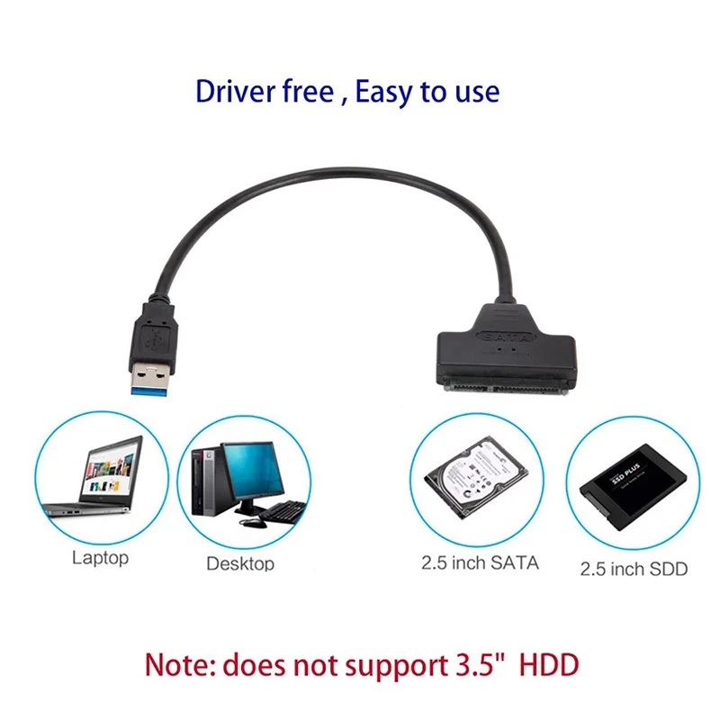 1. Данный USB 3,0 на SATA конвертер кабель соединяет с любыми стандартными 2,5 дюймов жесткий диск SATA или твердотельный накопитель (SSD) к компьютеру через USB 3,0 порта. Отлично подходит для резервного копирования файлов или обновления жесткого драйвера ноутбука.2. Спецификация SATA 3 поддерживает скорость до 6 Гбит/с. Позволяет легко переключаться между дисками без необходимости устанавливать диск внутри корпуса-просто подключи и работай.3. 2 светодиодный светильник указывает на мощность и состояние активности. Вы можете использовать его в любом месте без внешнего питания.4. Отлично подходит для подключения USB 3,0 периферийных устройств ПК, таких как жесткие диски, принтеры, сетевые концентраторы и многое другое.5. Полностью совместим с USB 3,0 и обратно совместим с USB 2,0/1,1.6. Примечание: Доступно только для ноутбука жёсткий диск и SSD, не указан для 3,5 дюймов deskbook hdd. Примечание: