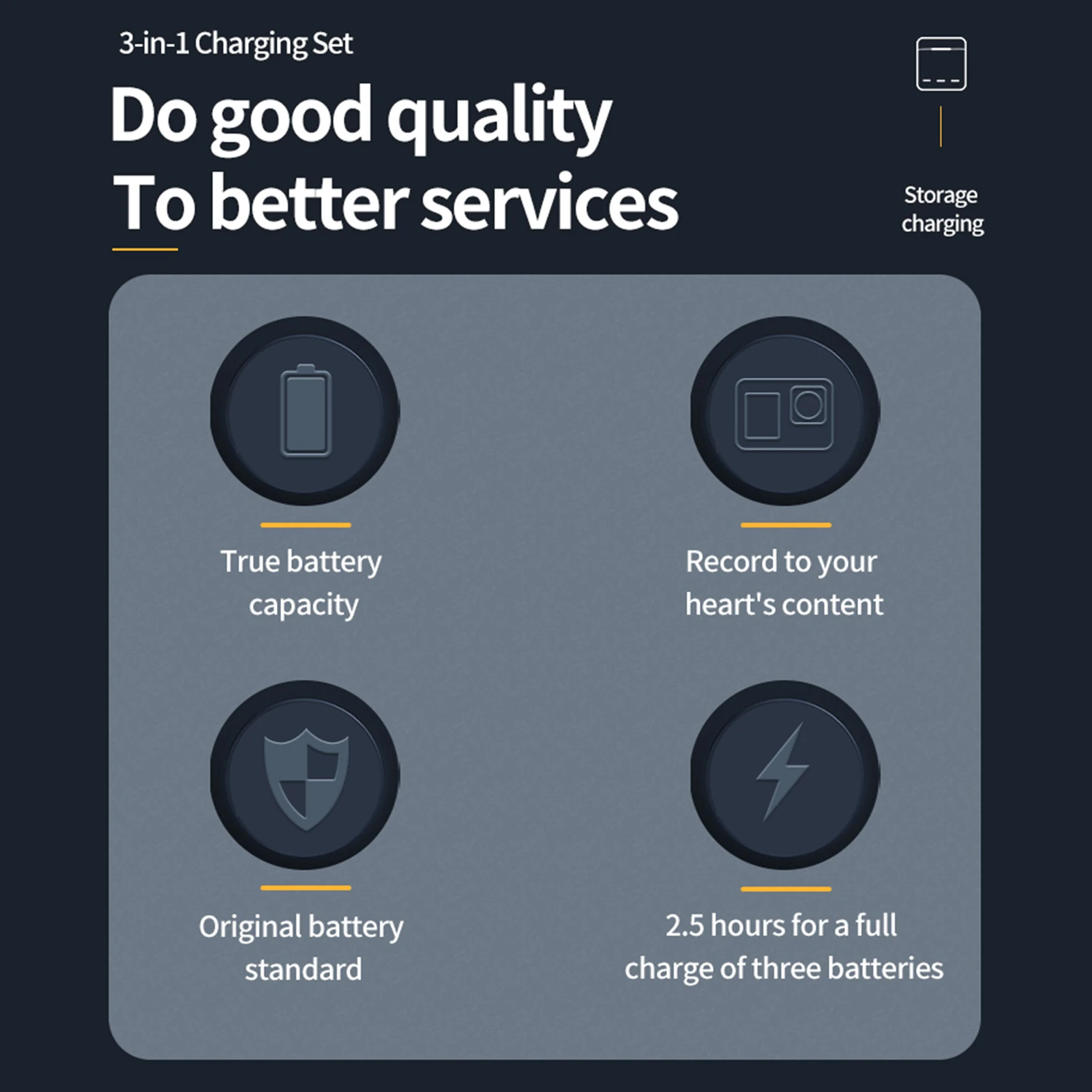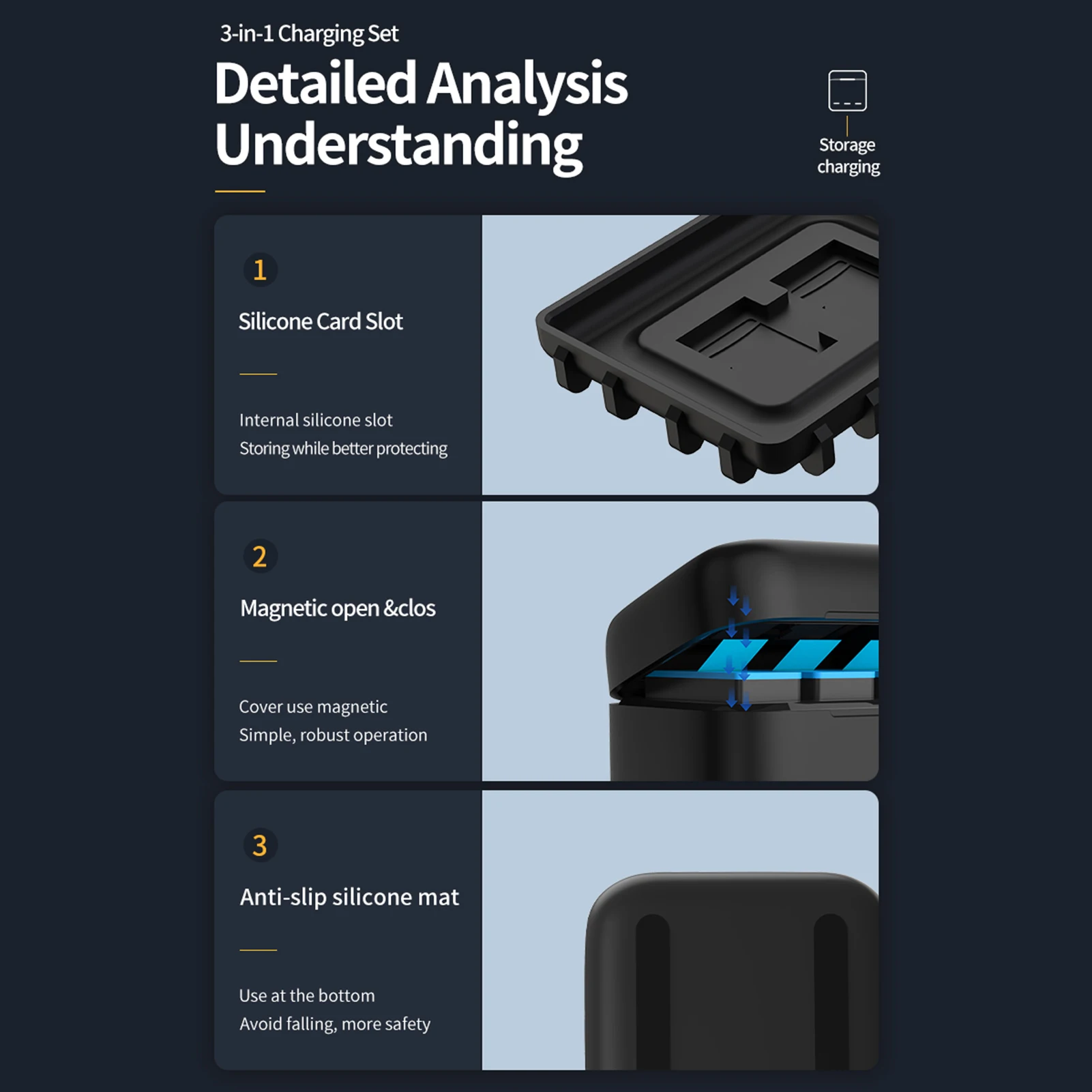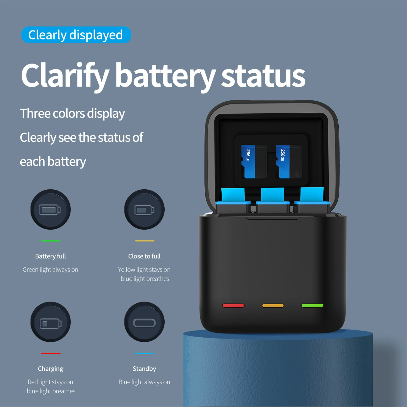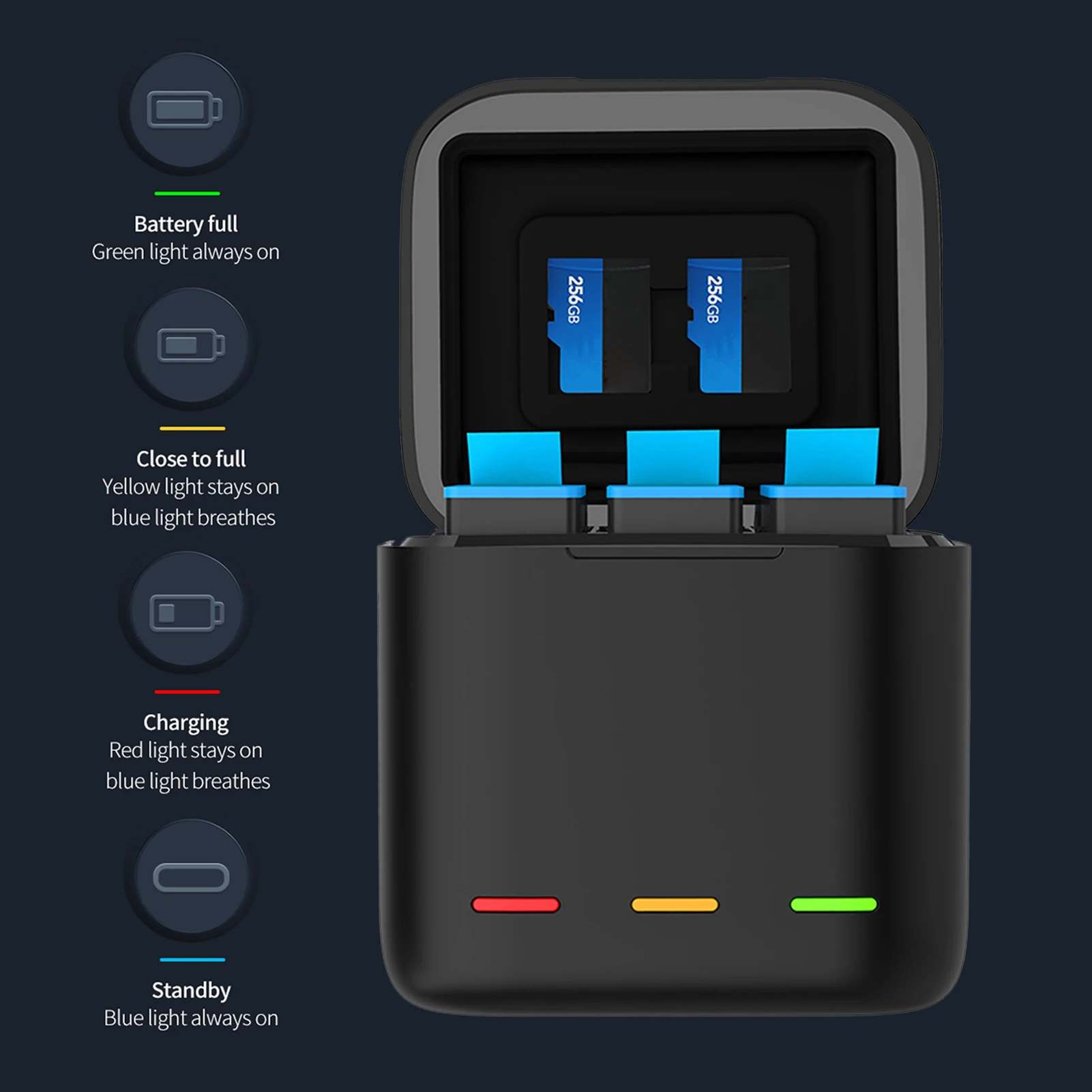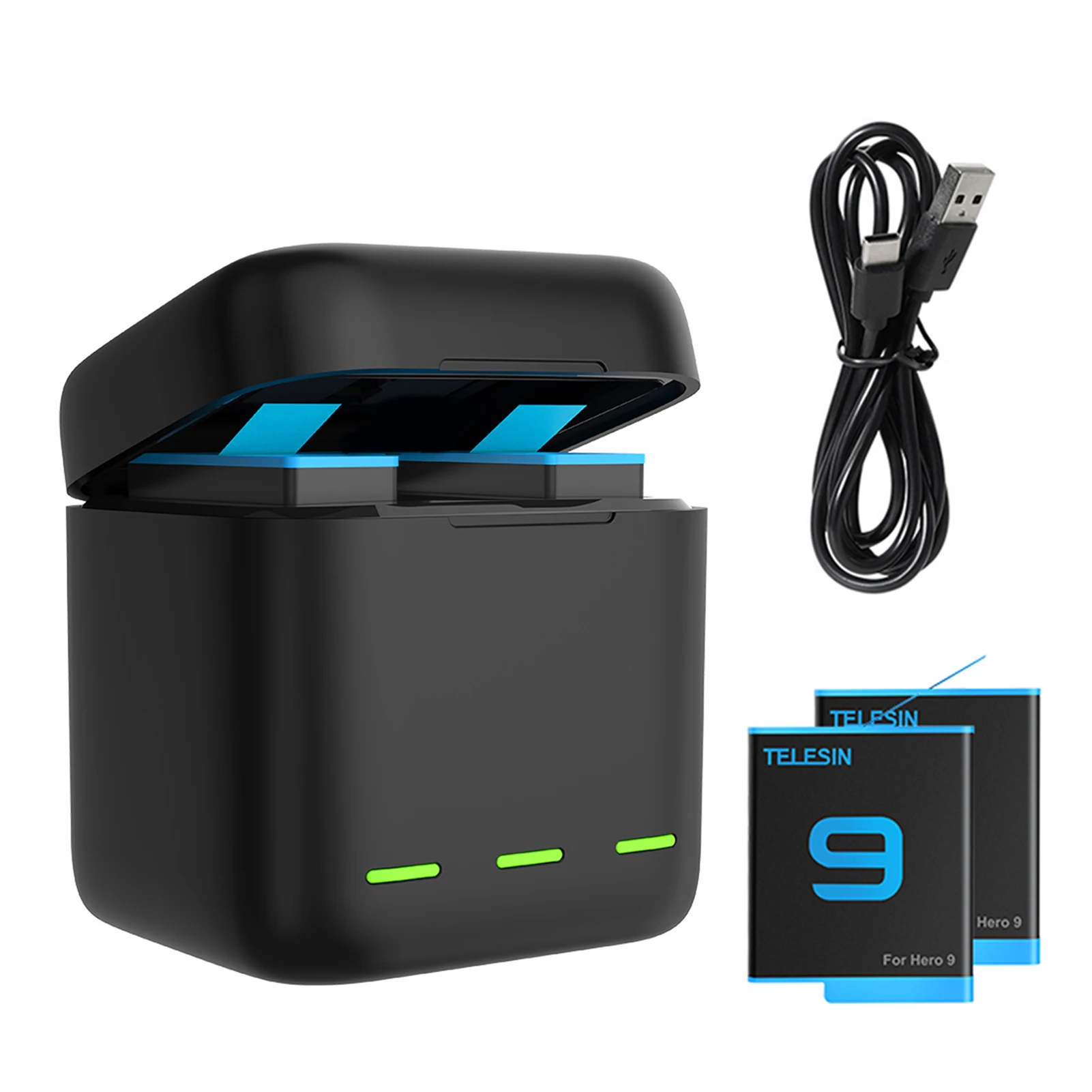 Зарядное устройство для тройного аккумулятора, 2 аккумулятора, зарядное устройство, кабель Type-C для Go Pro Hero9, набор аксессуаров для камеры черного цвета