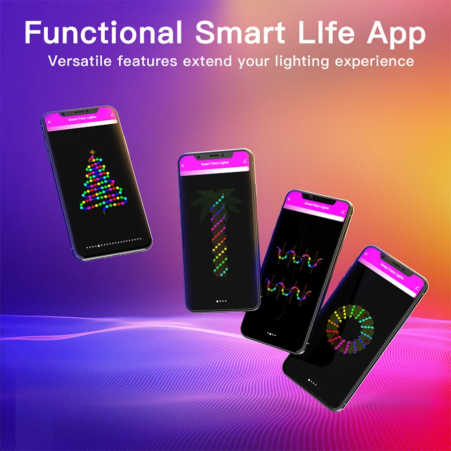 Простая настройка: сопряжение ламп с приложением «smart life», ссылка на Wi-Fi и начало включения/выключения, Изменение цветов и режимов воспроизведения музыки, тусклый 1%-100% яркость, установите таймер, Группа управления несколькими смарт-струнами и поделиться с семьей