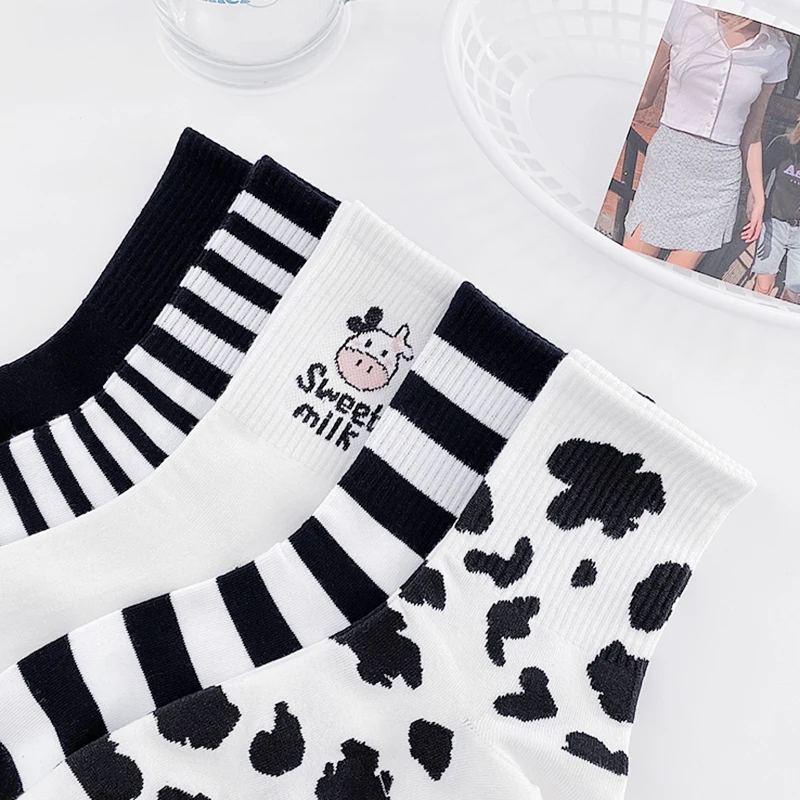 Носки полосатые с забавным принтом коровы, белые Мультяшные носки, уютные носки в стиле Харадзюку, женские носки с милыми животными, милые носки
