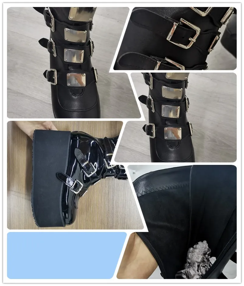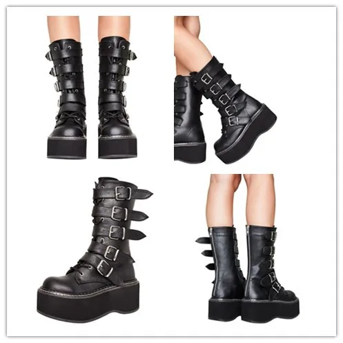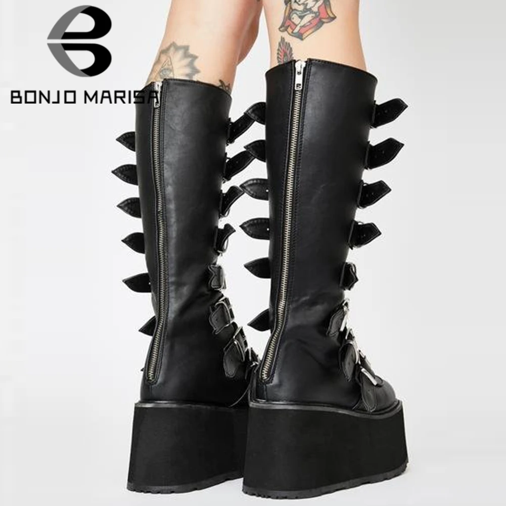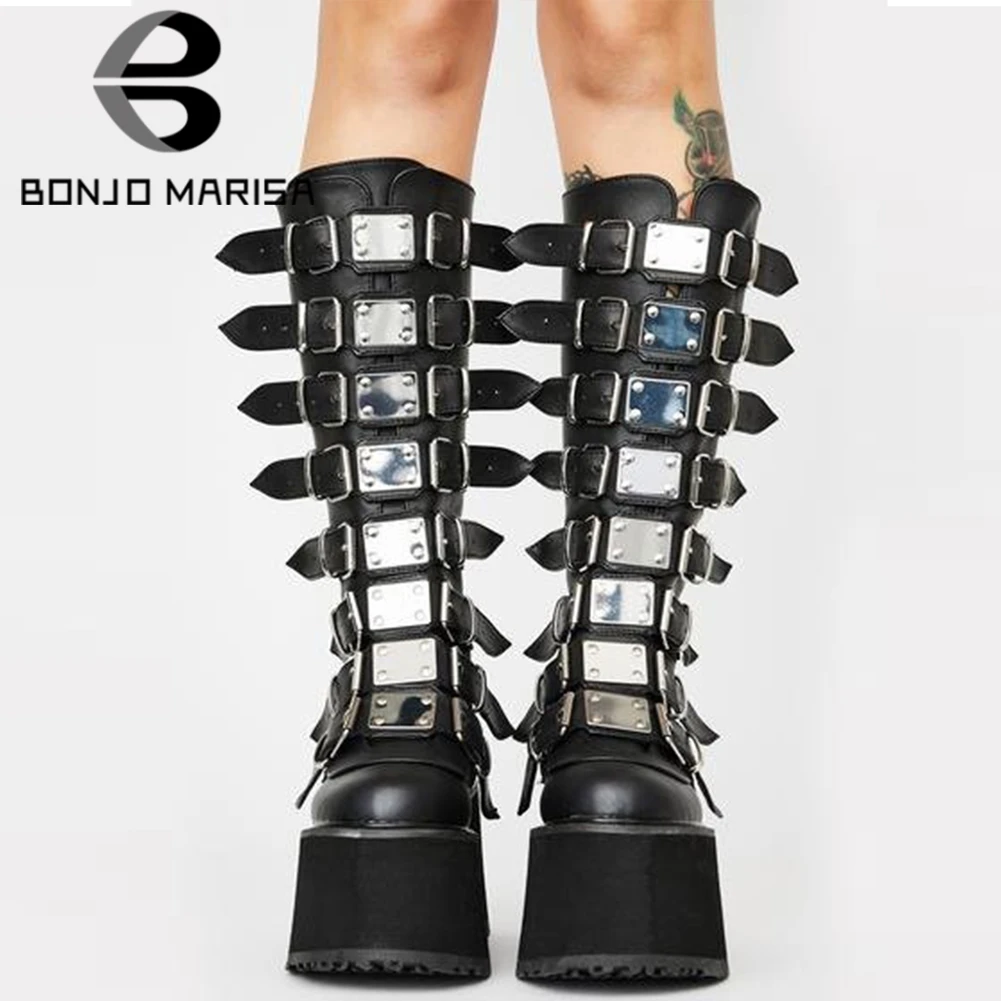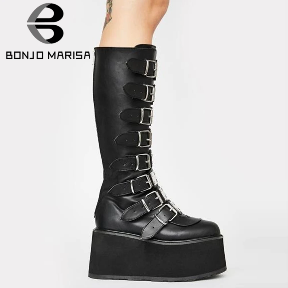 Женские ботинки на платформе BONJOMARISA, черные ботинки до середины икры, на толстом каблуке, с пряжкой, в готическом стиле, размера плюс