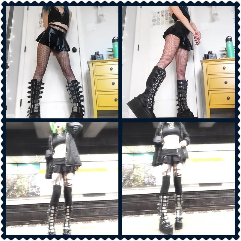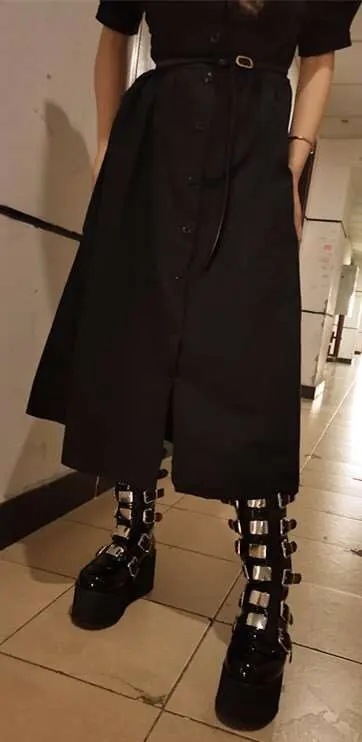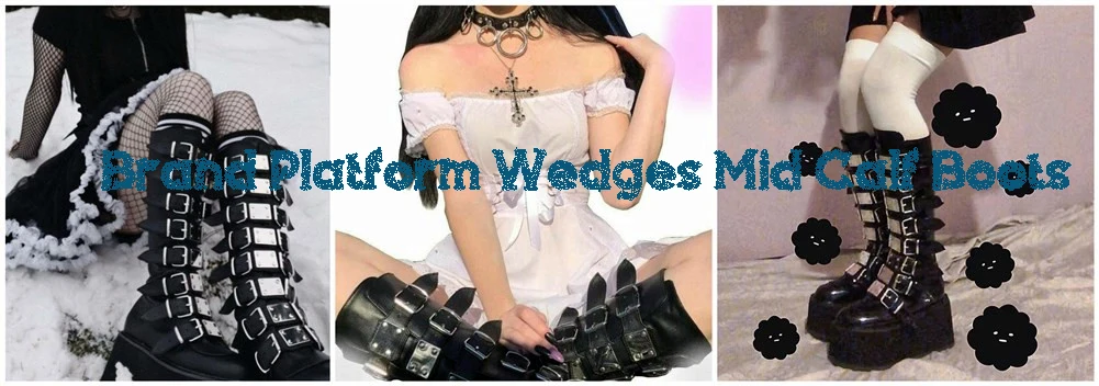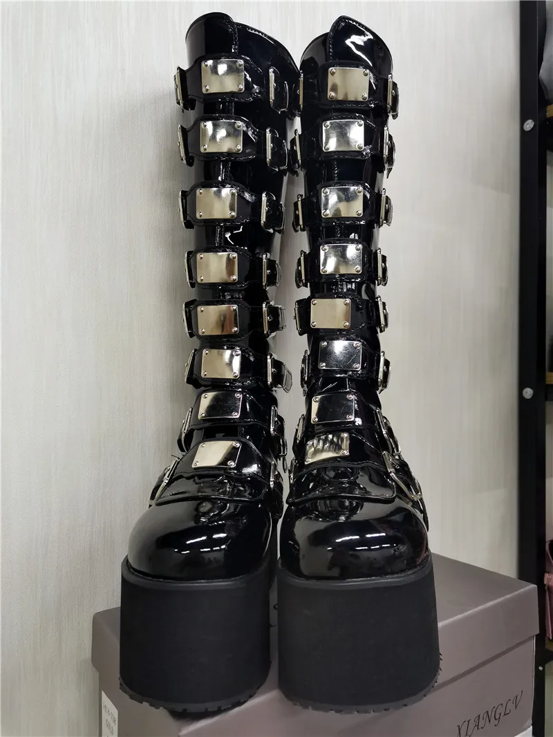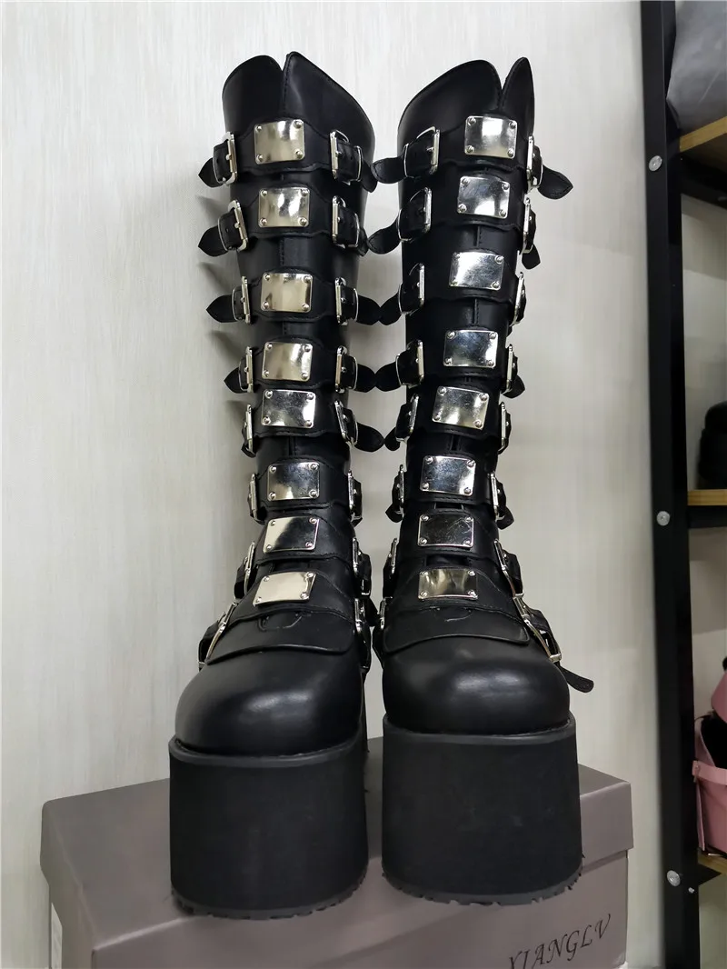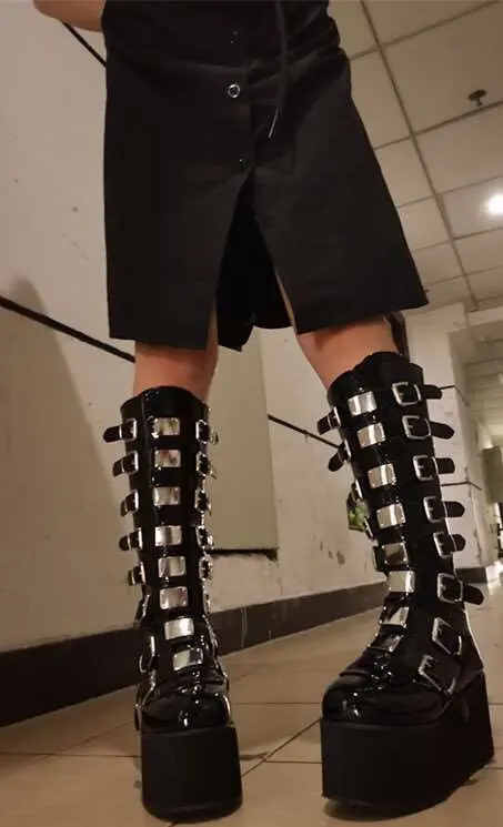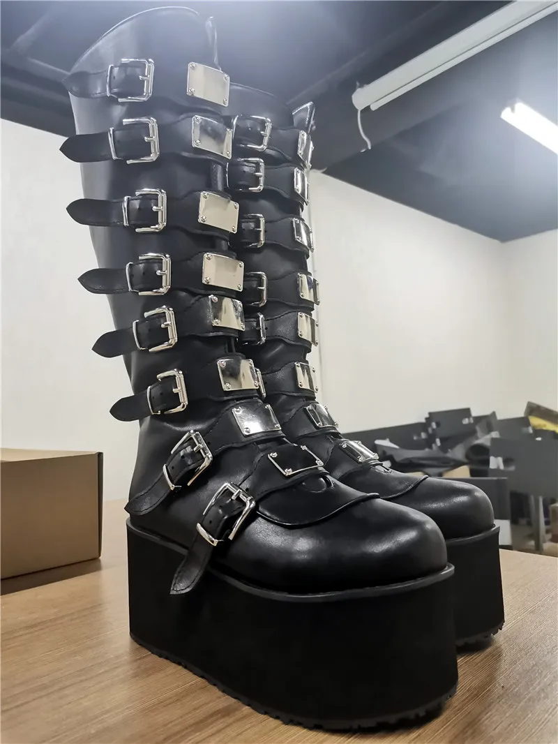 Женские ботинки на платформе BONJOMARISA, черные ботинки до середины икры, на толстом каблуке, с пряжкой, в готическом стиле, размера плюс