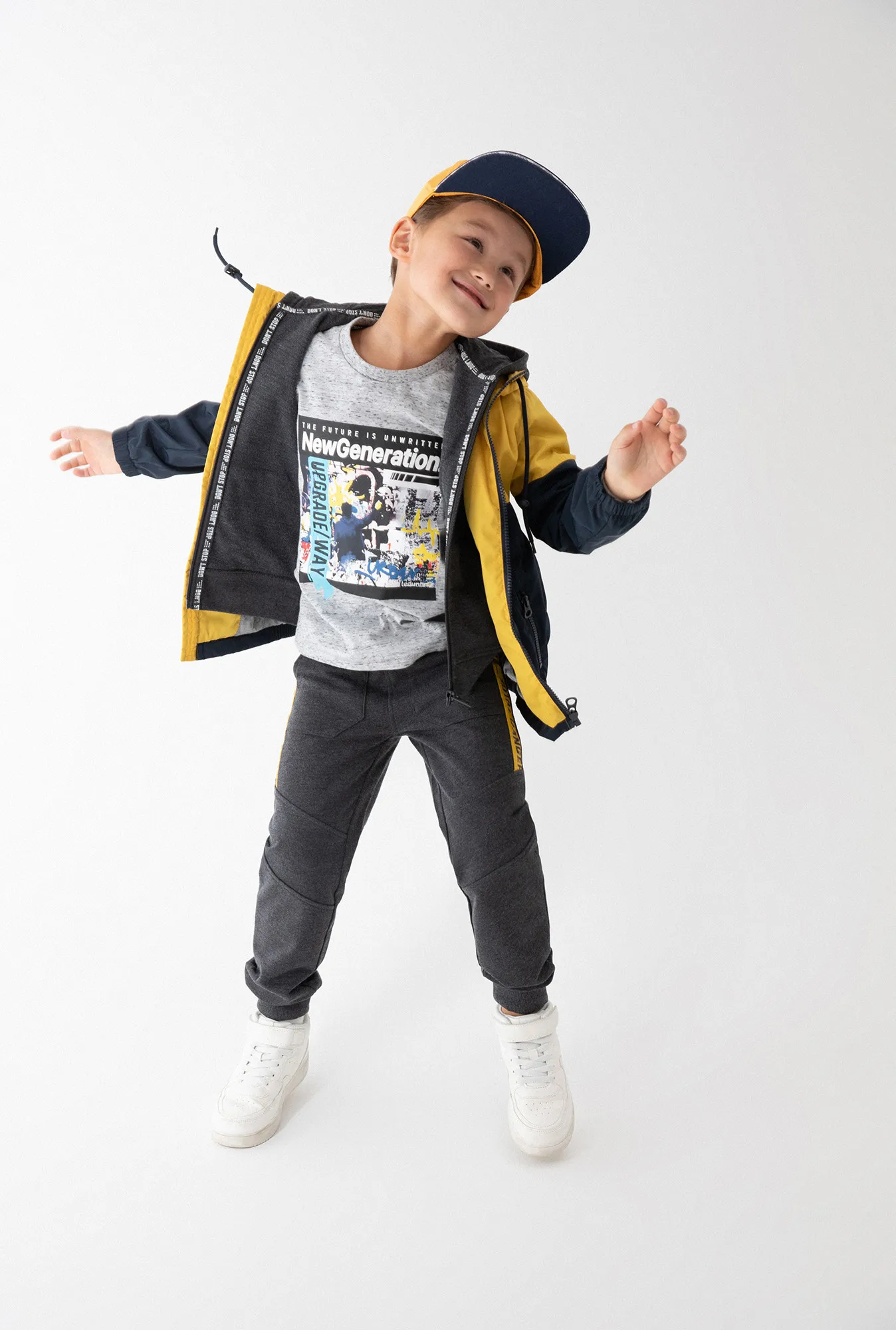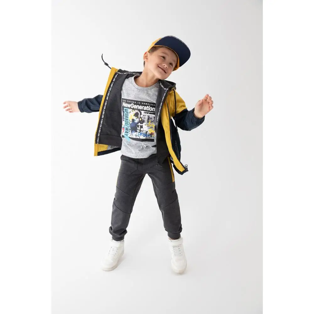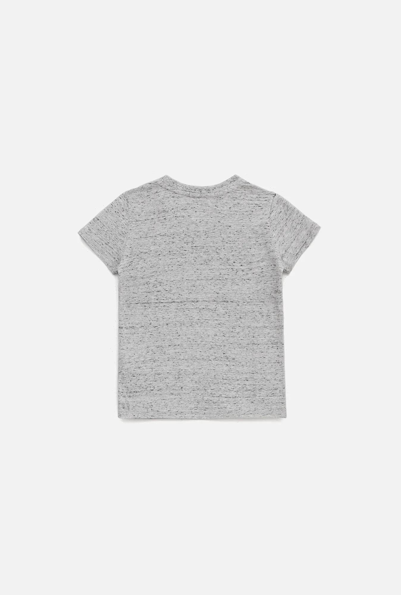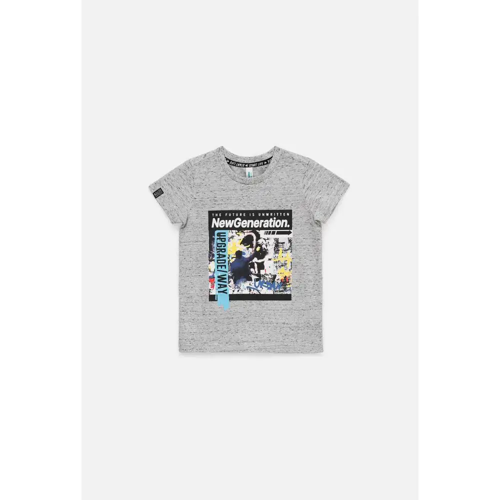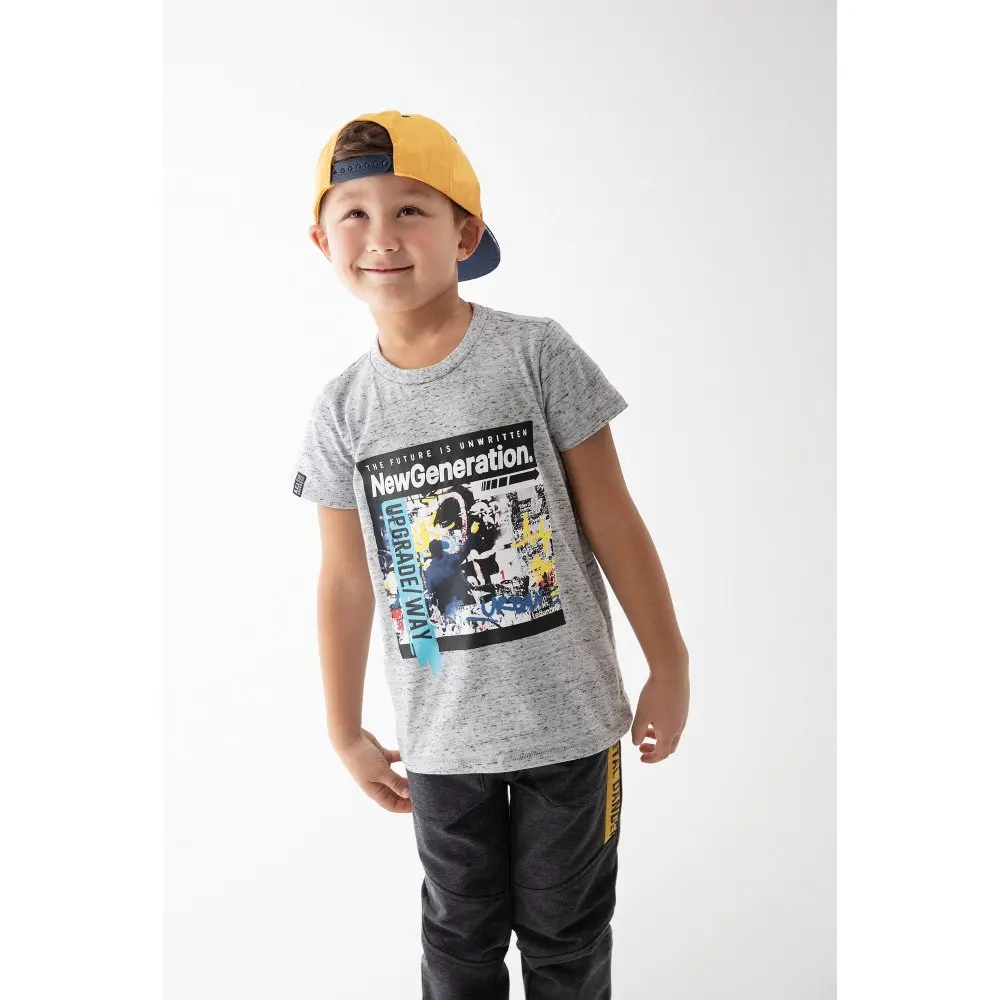 Футболка для мальчика прямого кроя, дополненная ярким принтом, сшита из меланжевого серого трикотажа, натурального, гипоаллергенного, приятного к телу и «дышащего» материала. Рост/размер одежды модели на фото: 110.