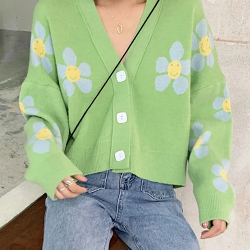 Осенние кардиганы для колледжа, свитер, Женский Свободный цветочный кардиган с V-образным вырезом, зеленый свитер, женский короткий топ, милое повседневное пальто, толстое пальто