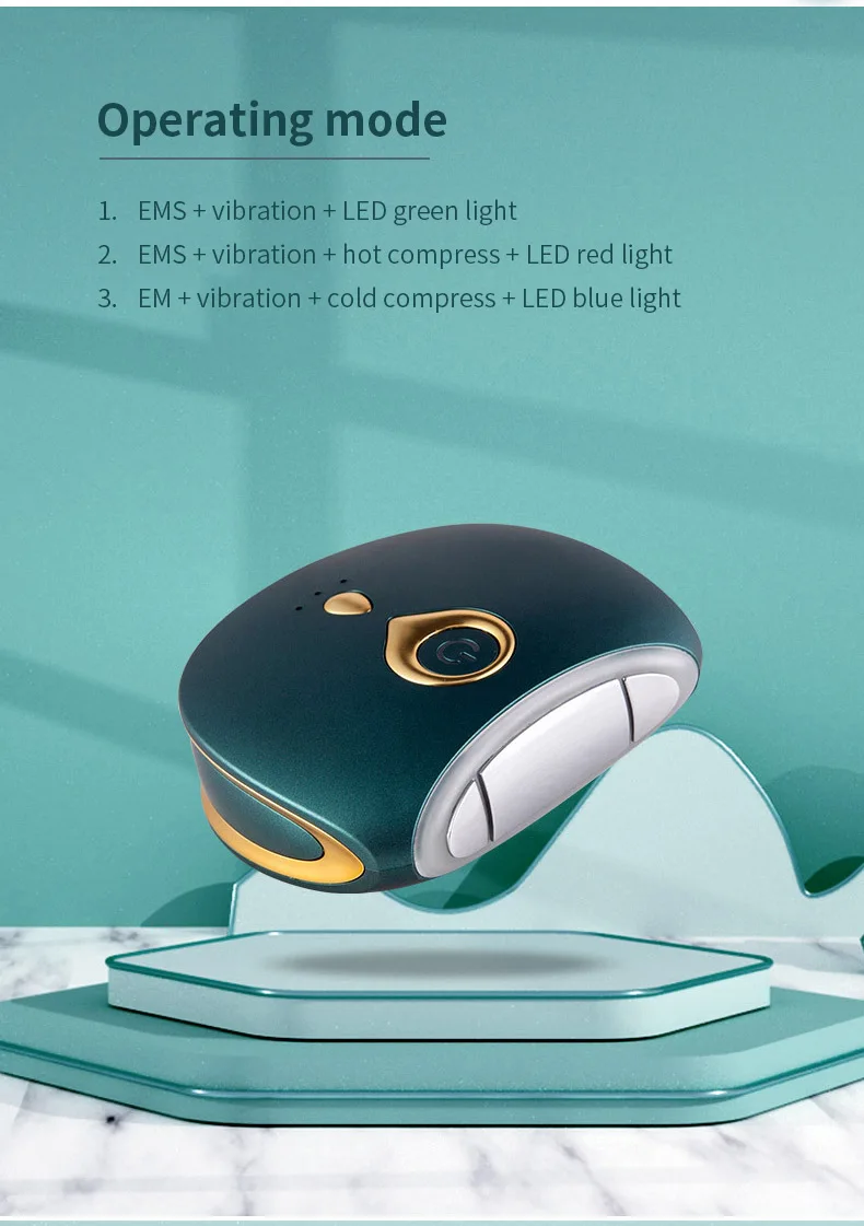 EMS+ Вибрация+ Зеленый светильник (нормальная температура), Красный светильник (горячий компресс) или синий светильник (холодный компресс).