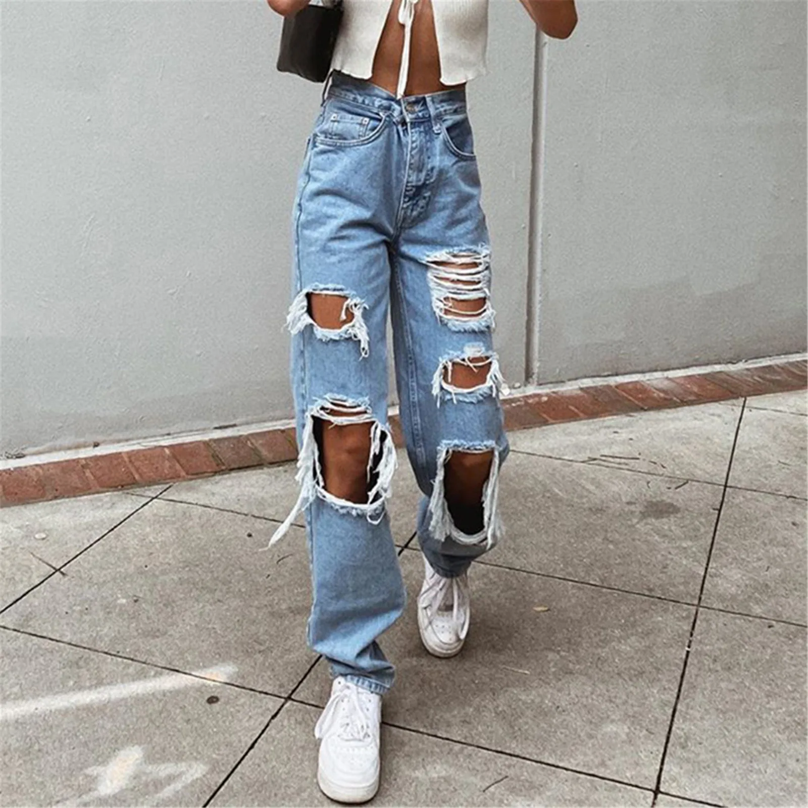 Женские модные сексуальные джинсы, повседневные брюки, длинные брюки с большими дырками, женские джинсы, рваные потертые свободные джинсовые брюки, женская одежда
