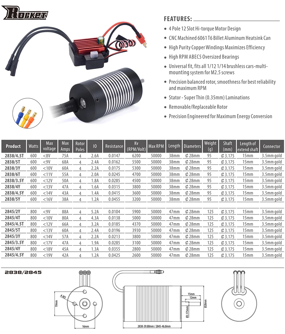 Особенности двигателя:4-полюсный 12 Слот hi-крутящий мотор дизайн.CNC обработанный алюминиевые заготовки 6061 T6 радиатор может, высокая чистота медных обмоток максимизирует эффективность.Высокие RPM ABEC5 негабаритные подшипники.Универсальный, подходит для всех 1/12 1/14 2S RC автомобилей и 3S гоночных автомобилей.Точный сбалансированный ротор, гладкость для лучшей надежности и максимальной скорости вращения.Статор-супер тонкий (0,35 мм) пластин.Съемный/сменный роторТочность разработана для максимального преобразования энергии.Характеристики ESC:1. Водонепроницаемость и защита от пыли для любых погодных заездов; (Примечание: Перед использованием этого ESC в воде удалите Вентилятор охлаждения; очистите и высушите его вскоре после использования, чтобы избежать ржавчины коннекторов.)2. Специально разработан для RC автомобилей с отличным запуском, ускорением и линейностью функций.3. Совместим с бессенсорным бесщеточным двигателем.4. Высокая устойчивость к току, отличное отведение тепла.5. Несколько функций защиты: защита от отключения низкого напряжения для литиевой или никелевой батареи/Защита от перегрева/Защита от потери сигнала/Защита от блокирования двигателя/6. Легко программируется и совместим с карточкой программы карманного размера.Описание:Это электронный регулятор скорости (ESC) для автомобиля. Система высокой мощности для модели RC очень опасна, поэтому внимательно прочитайте это руководство.Поскольку мы не можем контролировать правильное использование, установку, применение или обслуживание наших продуктов, мы не несем ответственности за любые повреждения,Потери или затраты в результате использования продукта. В отказе от каких-либо требований к работе, сбоям в работе и т. Д.Мы не несем ответственности за личные повреждения, последующие повреждения, вызванные нашим продуктом или качеством изготовления.Характеристики мотора:Бренд: RocketНазвание: Бесщеточный Бесконтактный двигатель 2845 RCЦвет: черныйКВ (об/мин/Вольт):3100кв/3800кв/4370кв/5000кв опциональноВатт: 800Макс. Об/мин: 50000Полюсы ротора: 4Диаметр: 28 ммДлина: 46,5 ммВал: 3,175 ммДлина вала: 15 ммРазъем: 4,0 мм золотоВес: 115 г35A ESCСпецификация:Бренд: SURPASSHOBBYНазвание: KK 35A ESCCont. Ток/ток разрыва: 35A/120AТип двигателя: Бесконтактный бесщеточный моторДля 2S Lipo или 6 ячеек NiMH:1. Дорожный: 28xx-размер или меньший двигатель с кв <6000кв2. Внедорожный/багги/монстр: 28xx-размер или меньший двигатель с кв <4000квДля 3S Lipo или 9 ячеек NiMH:1. Дорожный: 28xx-размер или меньший двигатель с кв <4000кв2. Внедорожный/багги/монстр: 28xx-размер или меньший двигатель с кв <3000квПодходящий автомобиль: 1/16 1/14 автомобильСопротивление: 0.0004омАккумулятор: 2-3S Lipo/4-9Cells NiMHВыход BEC: 5,0 в/2A (аналоговый режим)Размеры/вес: 40x32x2 0 мм/37 гПосылка включает в себя:Бесщеточный Бесконтактный двигатель Rocket 2845-1 шт.1 x серия KK 35A бесщеточный ESC1 х руководство на английском языке