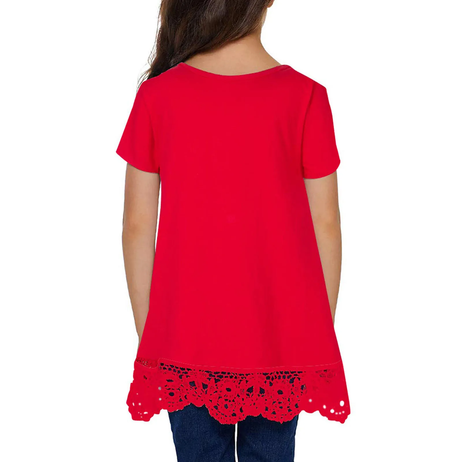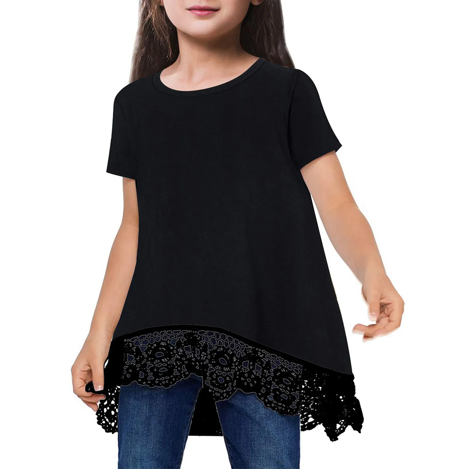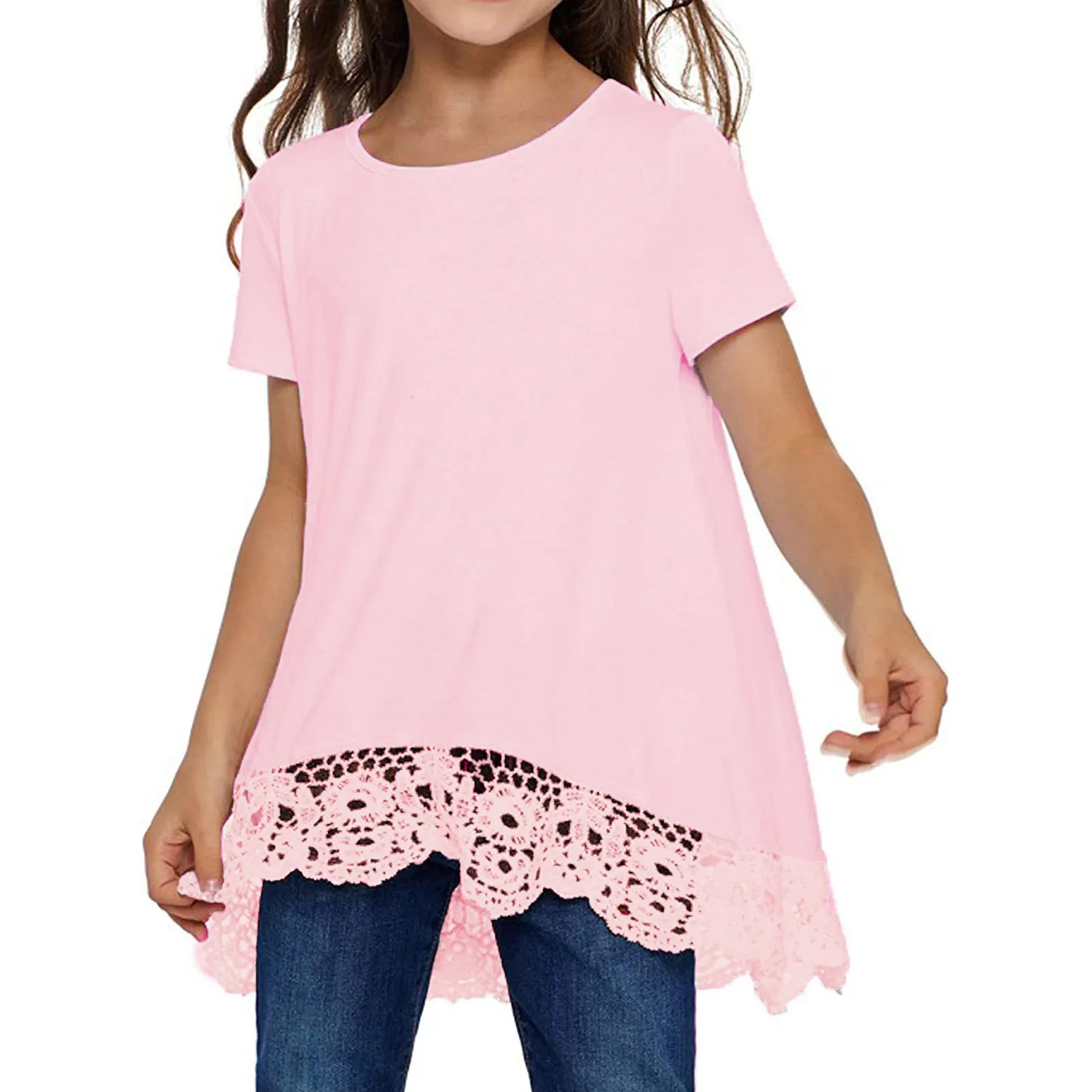 Одежда для девочек; Летняя однотонная кружевная Повседневная Туника; Топы; Свободные блузки; Футболка