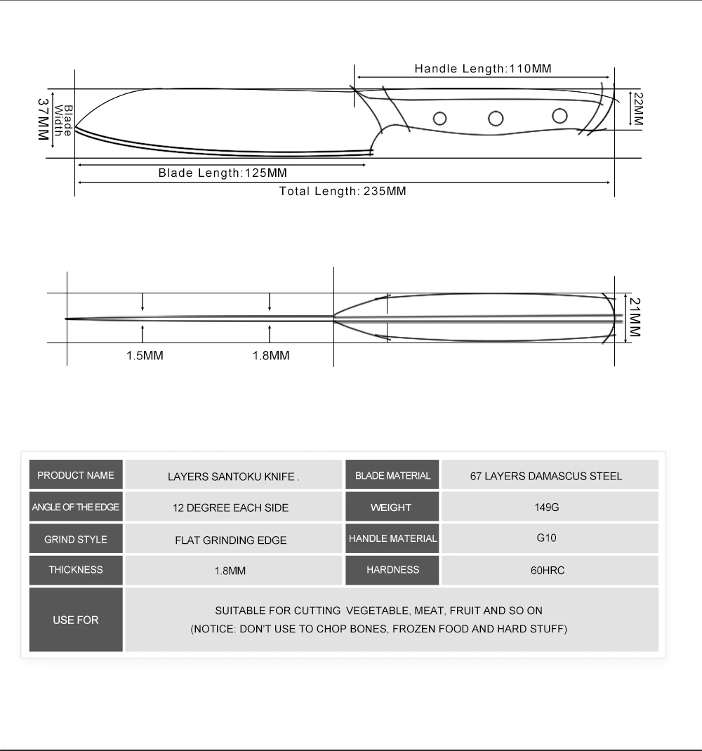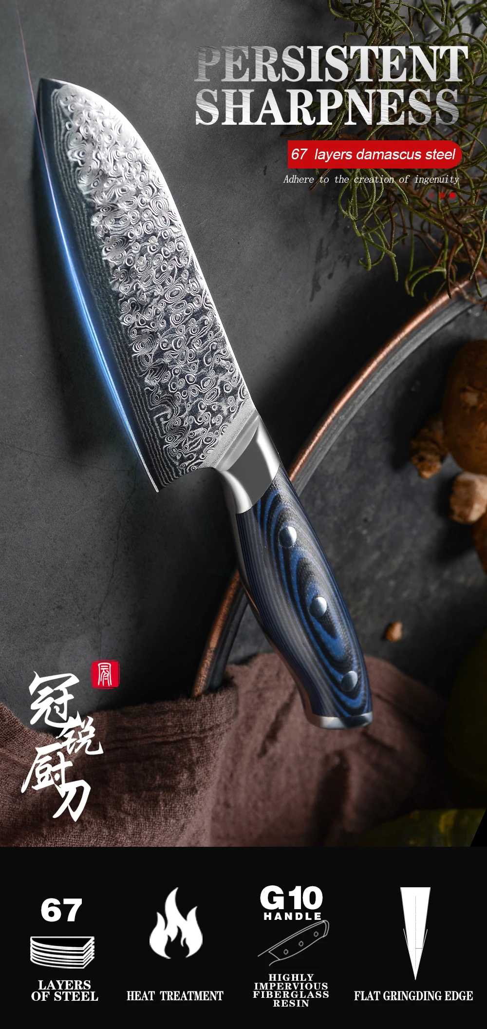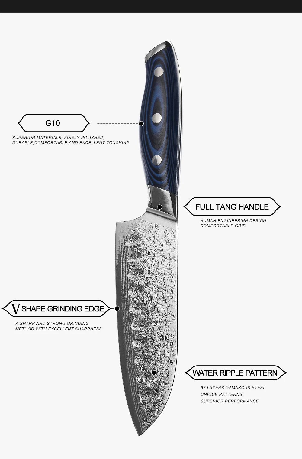 Материал лезвия: 67 слоев дамасской стали(Изготовлен из 67-слойной дамасской стали, импортированной из Японии. Режущий сердечник из стали VG-10;33-слойная нержавеющая сталь SUS430 и SUS431 с каждой стороны)Материал ручки: G10
