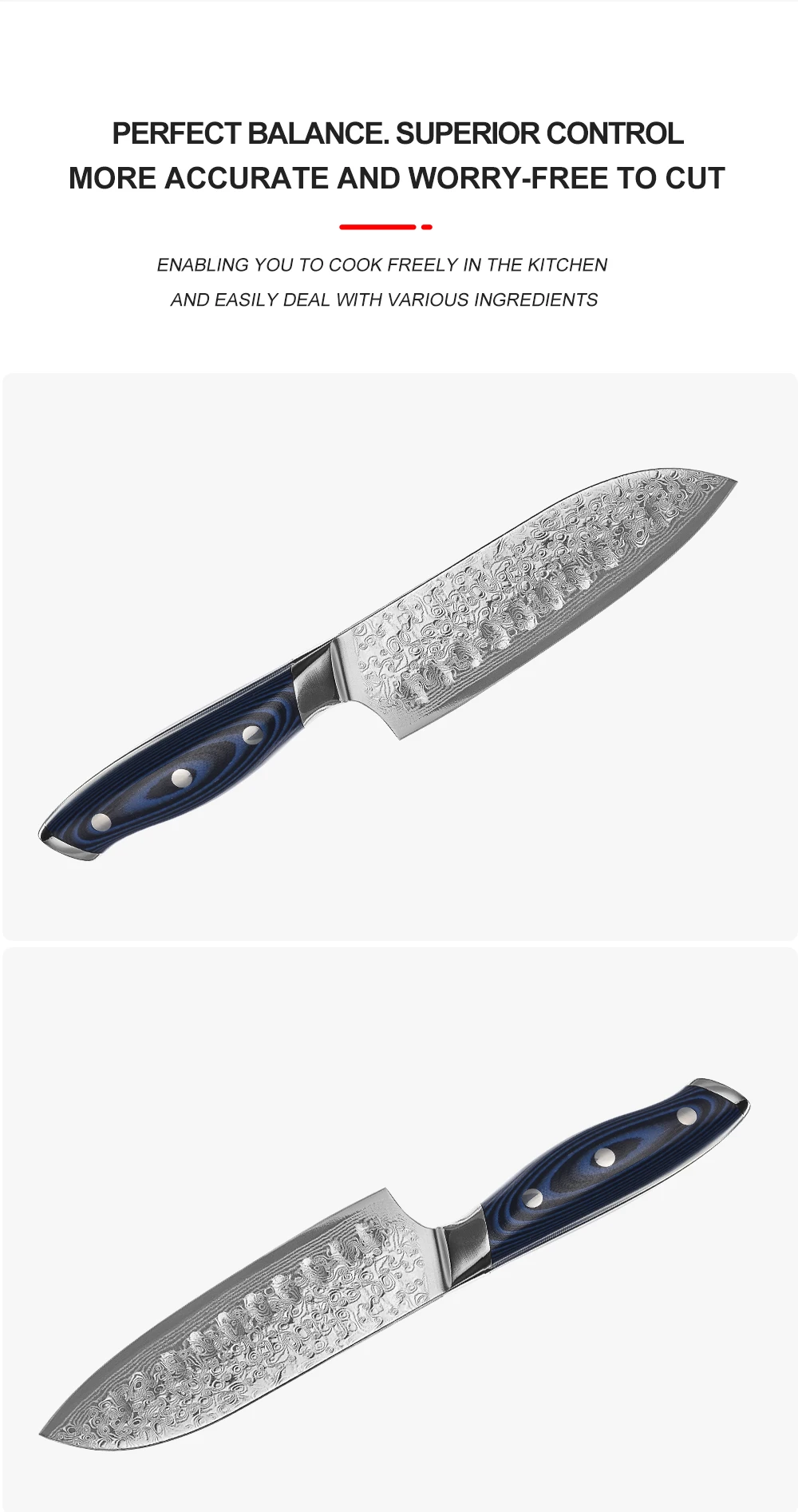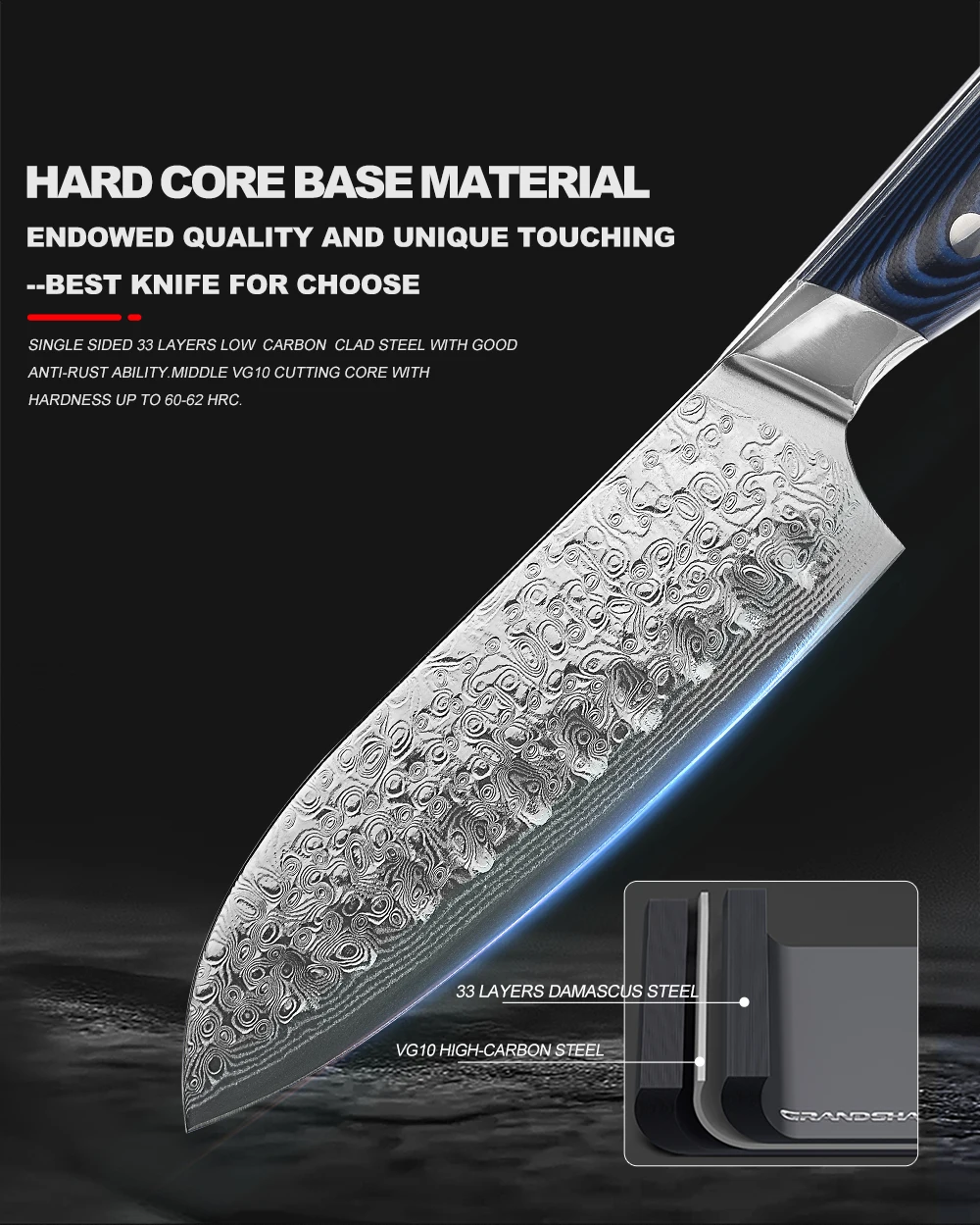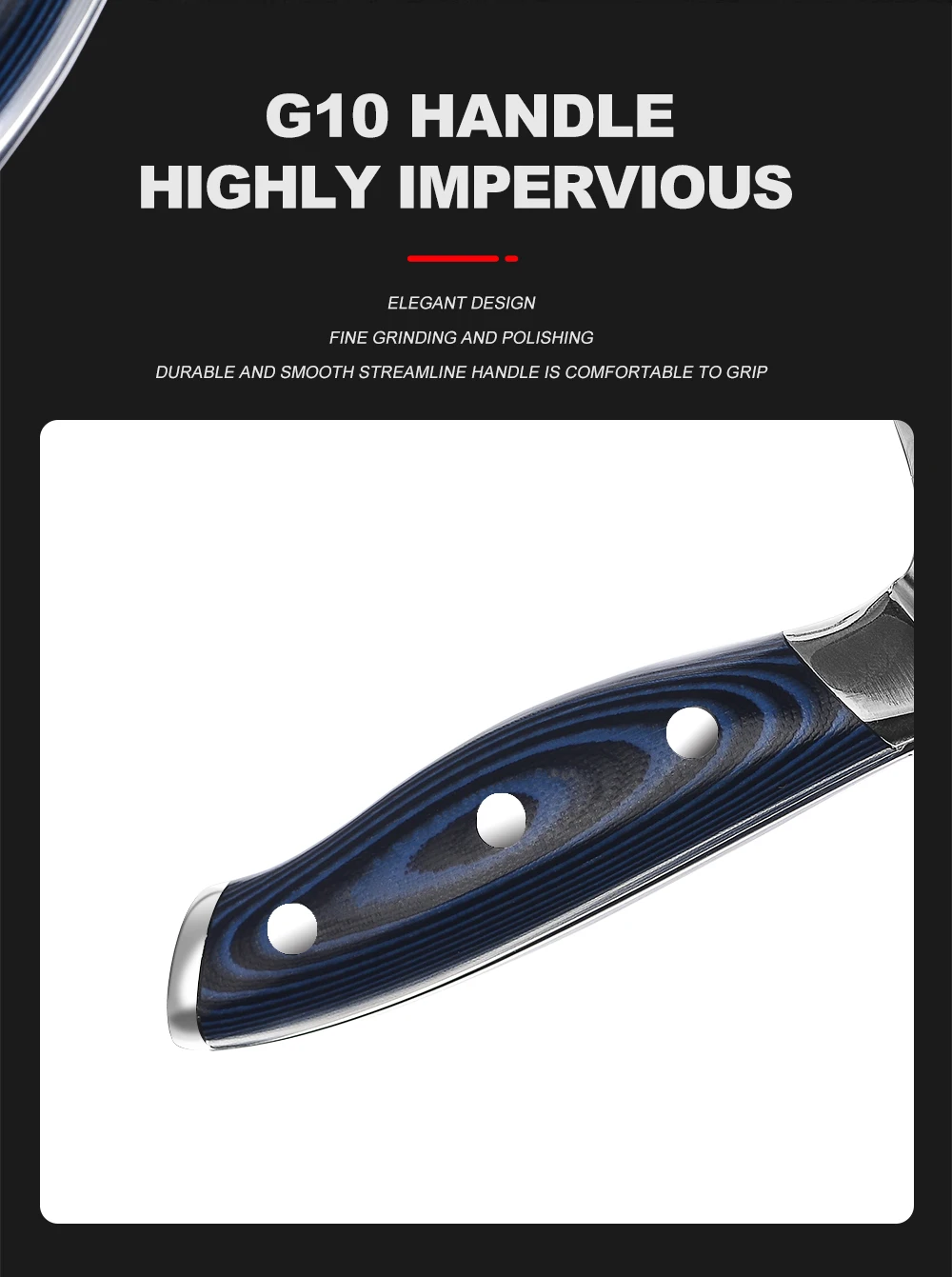 Материал лезвия: 67 слоев дамасской стали(Изготовлен из 67-слойной дамасской стали, импортированной из Японии. Режущий сердечник из стали VG-10;33-слойная нержавеющая сталь SUS430 и SUS431 с каждой стороны)Материал ручки: G10