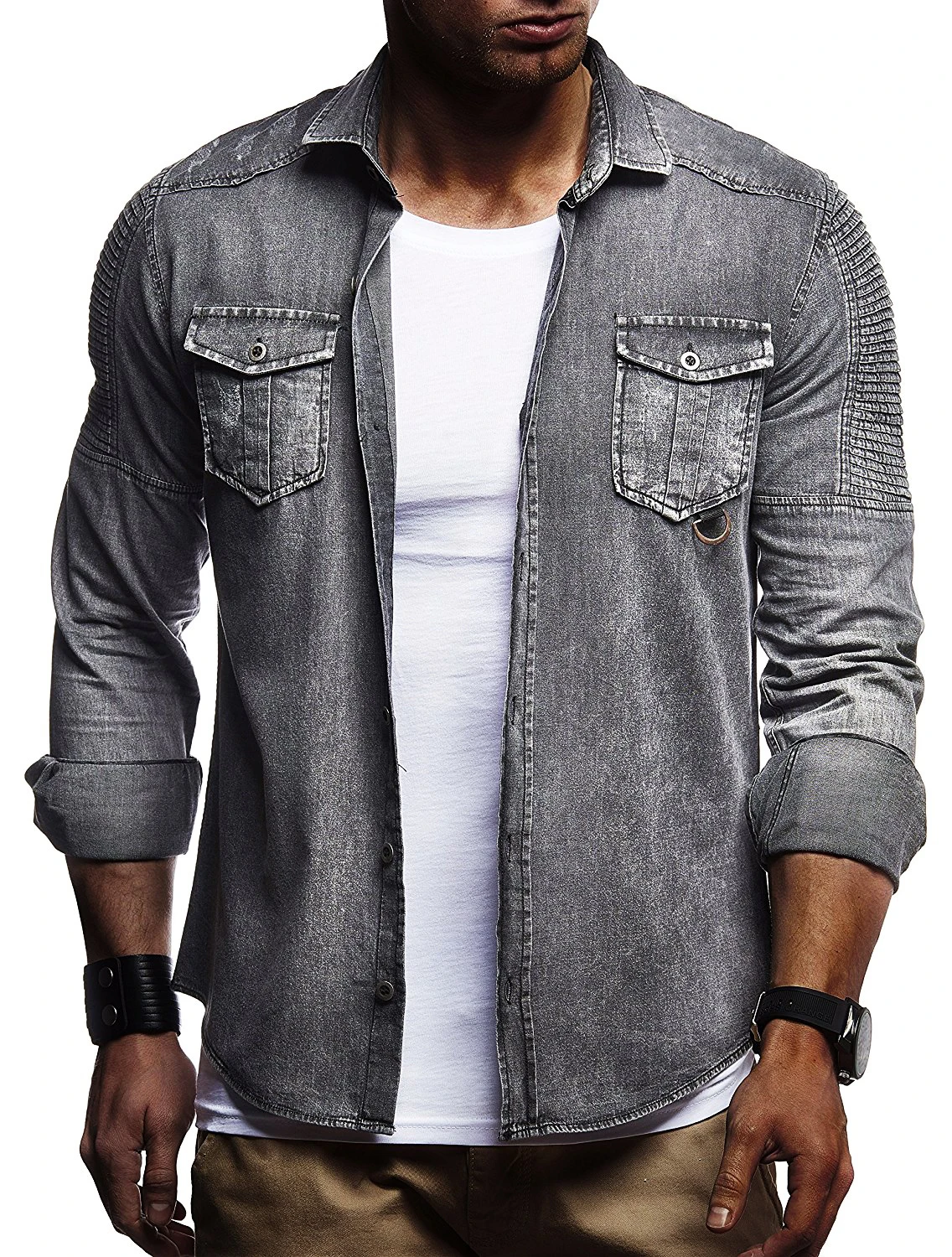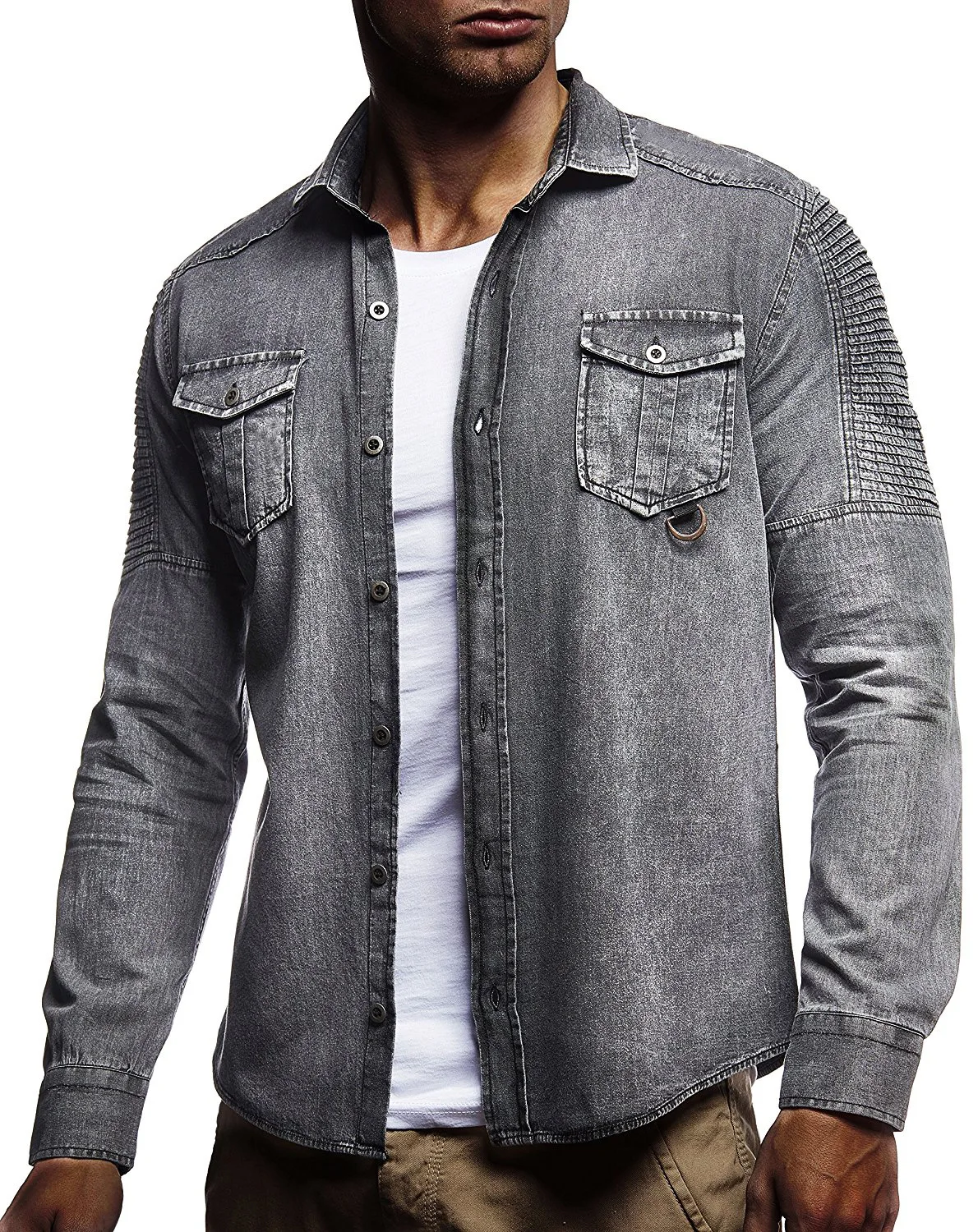 Мужская джинсовая рубашка с плиссированными рукавами и длинными рук...