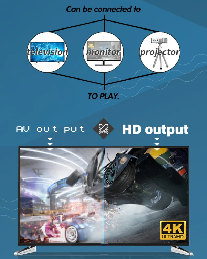 3. Просто подключите игровой хост к интерфейсу TV hdmi, подключите линию передачи данных от источника питания usb к хосту, настройте источник телевизора на соответствующий канал hd, И отображает изображение из списка игр по телевизору. Ручка может управляться удаленно путем размещения сухого аккумулятора. Подключи и играй, простой и щедрый, простой в эксплуатации.