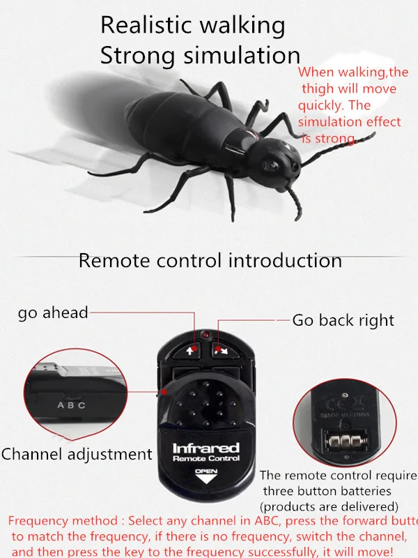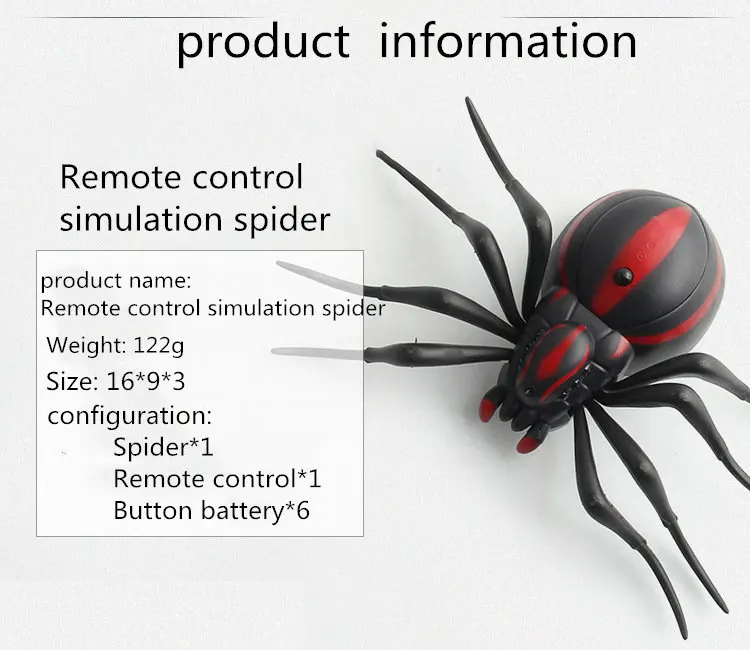 Название продукта: инфракрасный датчик тараканов с дистанционным управлениемМатериал: пластик + электронные компонентыРазмер:Таракан: 14*9*3,5 смAnt: 10*12,5*3 смПаук: 16*9*3 смУдаленное Расстояние: менее 10 мОсобенности: игрушки для животных с дистанционным управлением, искусственное насекомое, подарки на Хэллоуин, реквизит для косплея, инфракрасные игрушки