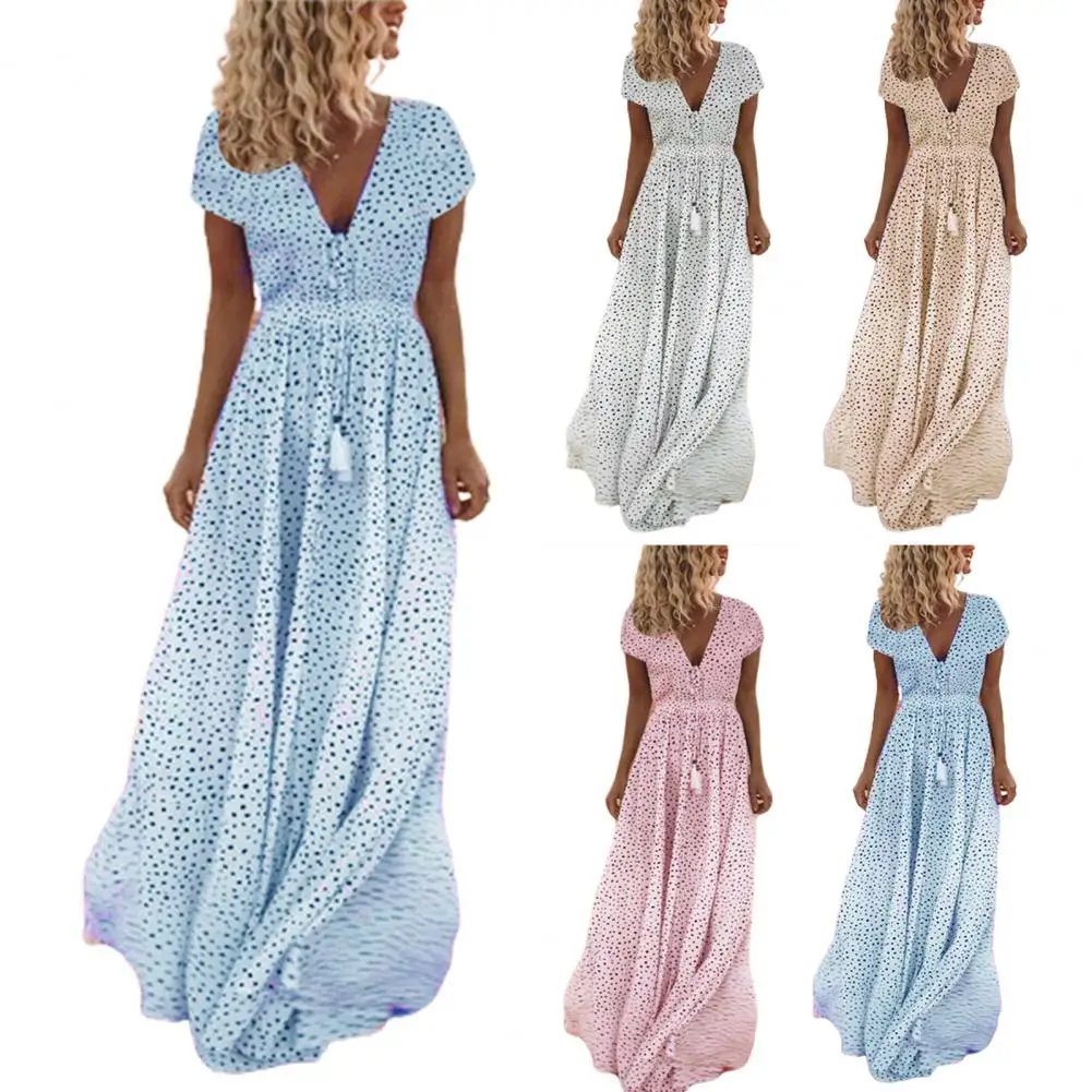 Длинное платье с принтом в горошек; Летнее Платье макси с короткими рукавами и v-образным вырезом; Вечерние платья