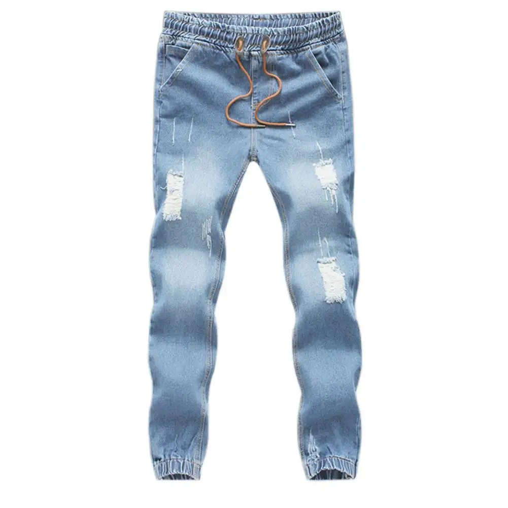 Мужские узкие длинные брюки с карманами, Длинные мужские рваные узкие джинсы, синие джинсы-карандаш, удобные синие брюки высокого качества