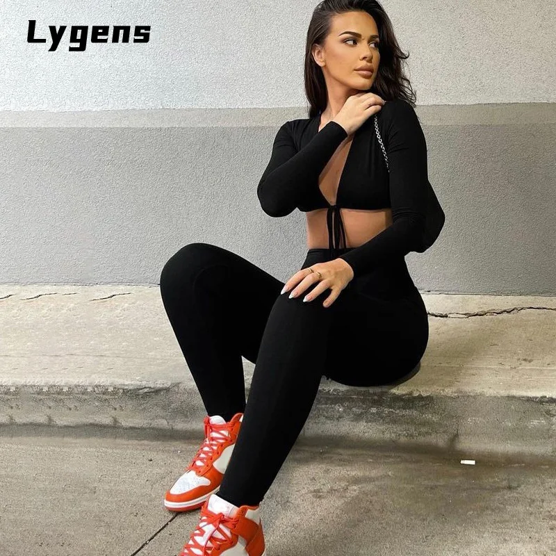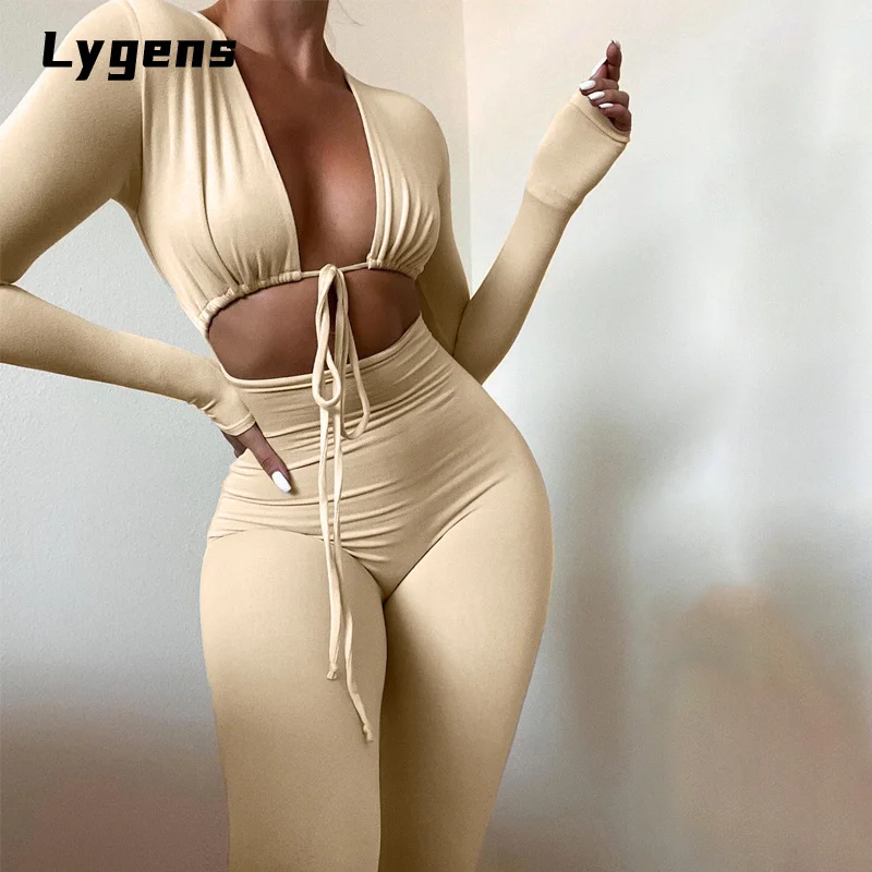 Lygens 2021 осенний однотонный бандажный комбинезон на шнуровке с длинным рукавом, женская мода, уличная одежда, сексуальные наряды для клувечерние