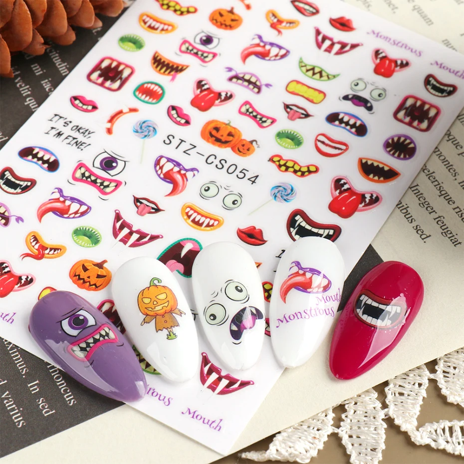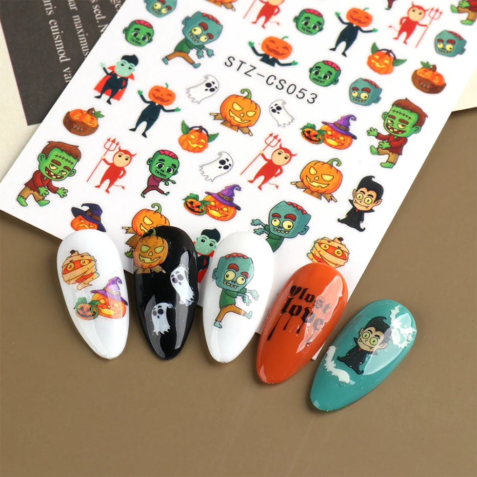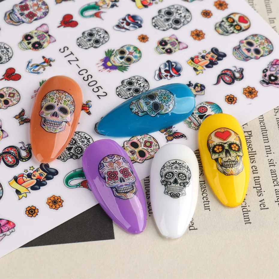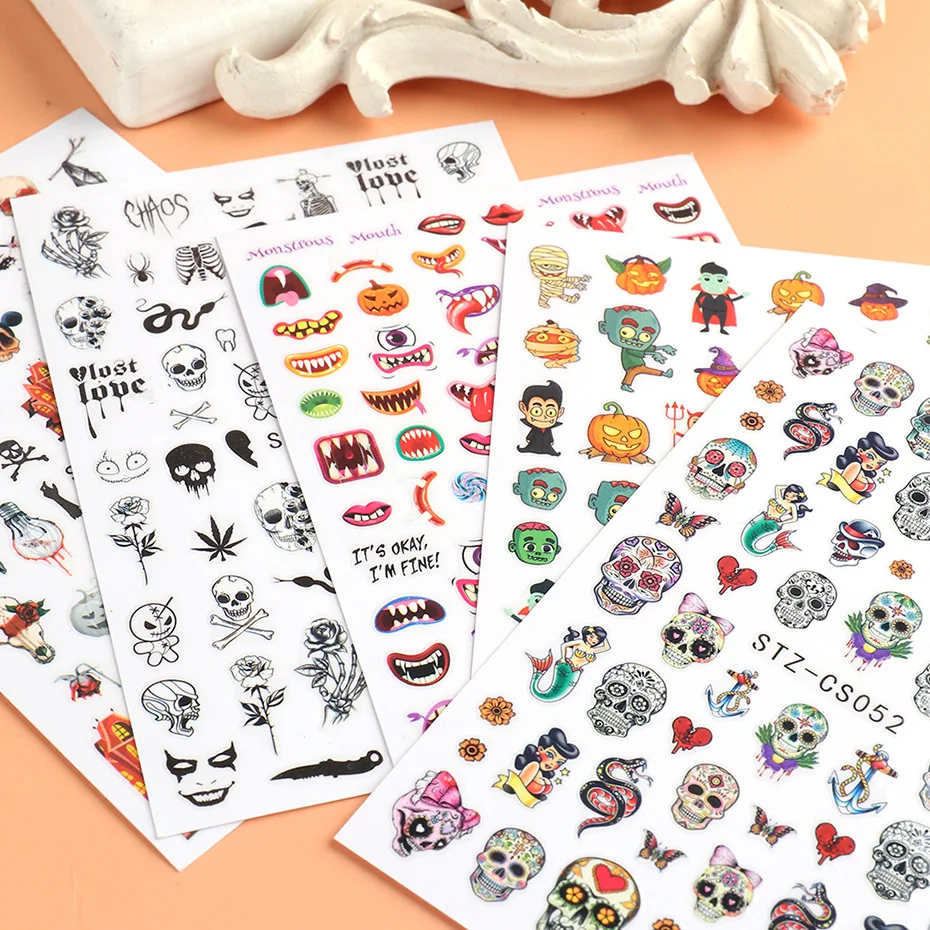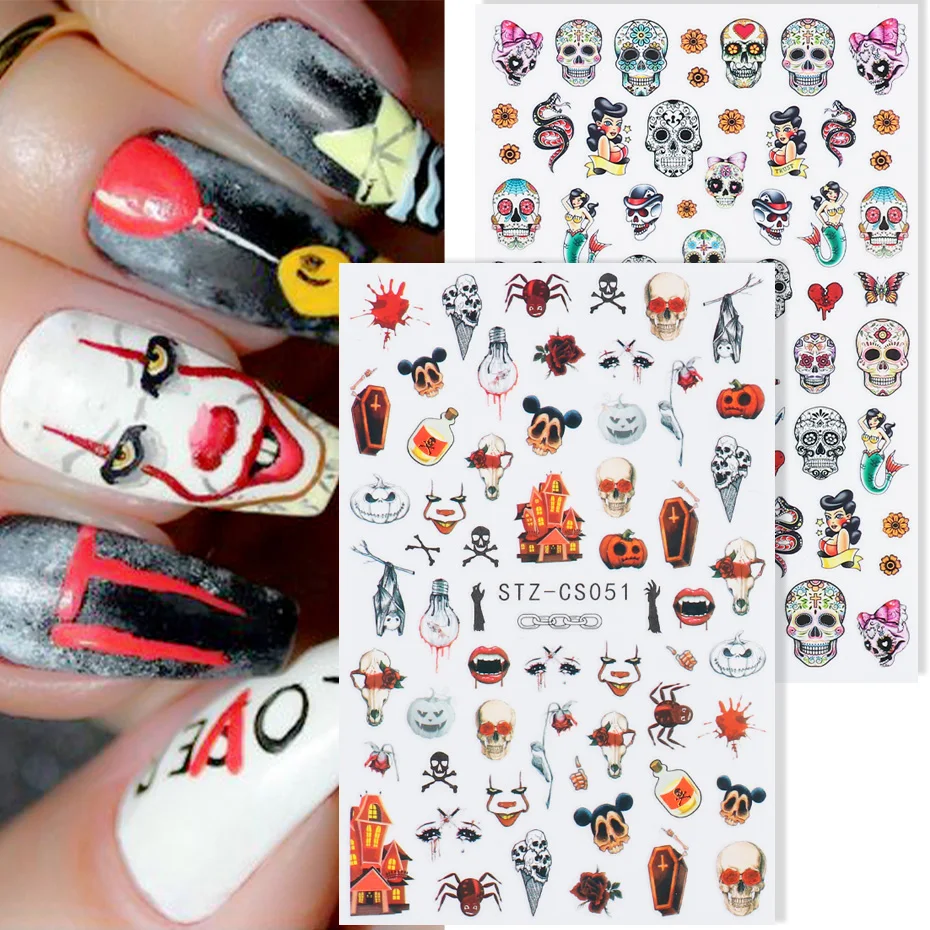 Хэллоуин наклейки для ногтей Череп кости клоун Тыква слайдеры змея аниме мультфильм наклейка в виде паука маникюр декор SASTZCS050-057